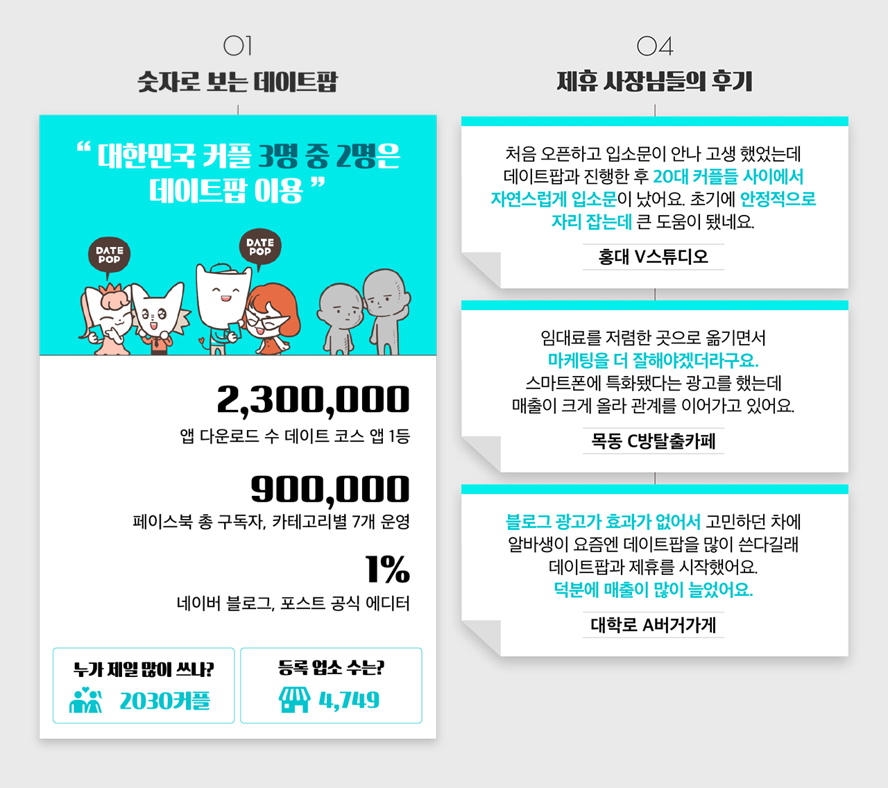 많은 시행착오 끝에 작년 가을 기준으로 팝딜 제휴점 120개를 돌파했고, 현재는 500개 업체가 데이트팝과 함께 하고 있다. 재계약률 역시 80% 수준으로 안정적으로 운영되고 있는 추세이다. (20대 타겟 온라인 광고를 원하시는 사장님은 여기를 클릭하세요.)