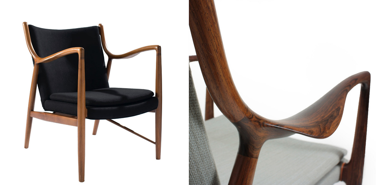 이지체어 No.45는 핀 율을 대표하는 의자로, 나무를 깎은 것이 아니라 빚은 듯한 곡선의 팔걸이를 가진 의자로 유명하다.