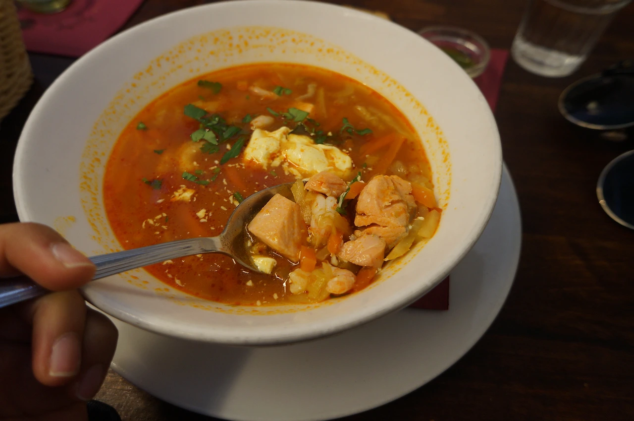 사진을 보고 신기하게 생겨서 먹어 보고 싶었던 씨푸드 수프. 맑은 탕이긴 한데 정확하게 무슨 맛이라고 표현을 못하겠다. 약간 빨갛게 끓인 무국 같은 느낌이기도 하고.. 일단 연어 살이 통째로 많이 들어가 있고, 무, 당근, 부추가 적당히 들어간 따끈한 국으로 개인적으로는 속도 편하고 간도 세지 않아서 맛있었다.
