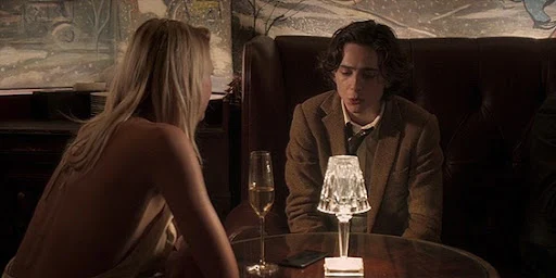 애슐리의 당초 계획이었던 감독과의 인터뷰는 어쩌다보니 각본가 그리고 배우와 데이트로 이어지며 남자친구 개츠비와의 데이트는 뒷전이된다. 홀로 맨허튼을 배회하던 개츠비는 비를 피해 탄 택시에서 아까 영화 촬영장에서 만났던 전여친의 여동생 챈을 만난다. 챈은 여기서 청바지에 흰 티를 입고 빨간 보머 자켓을 입고 나온다. 개츠비와 애슐리의 스타일에 비해 캐주얼한 챈의 스타일은 활동적이고 외향적인 느낌을 넘어서 뭔가 다른 게 있지 않을까하는 기대감까지 준다. 나는 챈의 옷을 보고서야 이 영화의 배경이 90년대 혹은 그 이전이 아닌 동시대라는 걸 실감했다.
