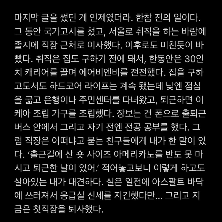 제대로 된 글은 작년 12월을 끝으로 한 반년 간 안 썼다. 안 썼다기보단 못 썼다. 변명이지만 시험 준비하고, 취직하고, 이사하고, 이직하고 또 이직하고… 그러느라. 8개월 동안 제법 험난했다. 그래도 그 와중에 글을 쓰려고 한 게 메모장에 남아 있기는 하다. 이걸 손볼까 하다 이전 직장에서 마음고생한 것도 같이 떠올라 그냥 묻어두기로 했다.