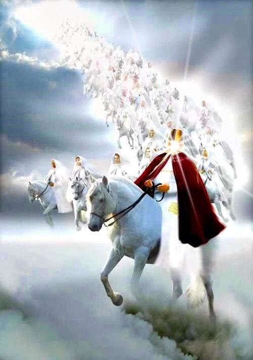 14 하늘에 있는 군대들이 희고 깨끗한 세마포 옷을 입고 백마를 타고 그를 따르더라