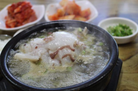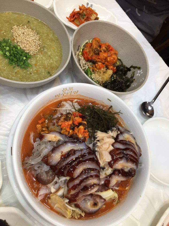 시장 내 속초문어국밥(033-638-8837)은 생소한 문어국밥이 메인이다. 속초 앞바다에서 잡은 참문어를 얇게 썰어 소고기 국밥 위에 올려져 나온다. 문어는 국물에 샤부샤부처럼 살짝 데쳐 먹어야 제맛을 느낄 수 있다.