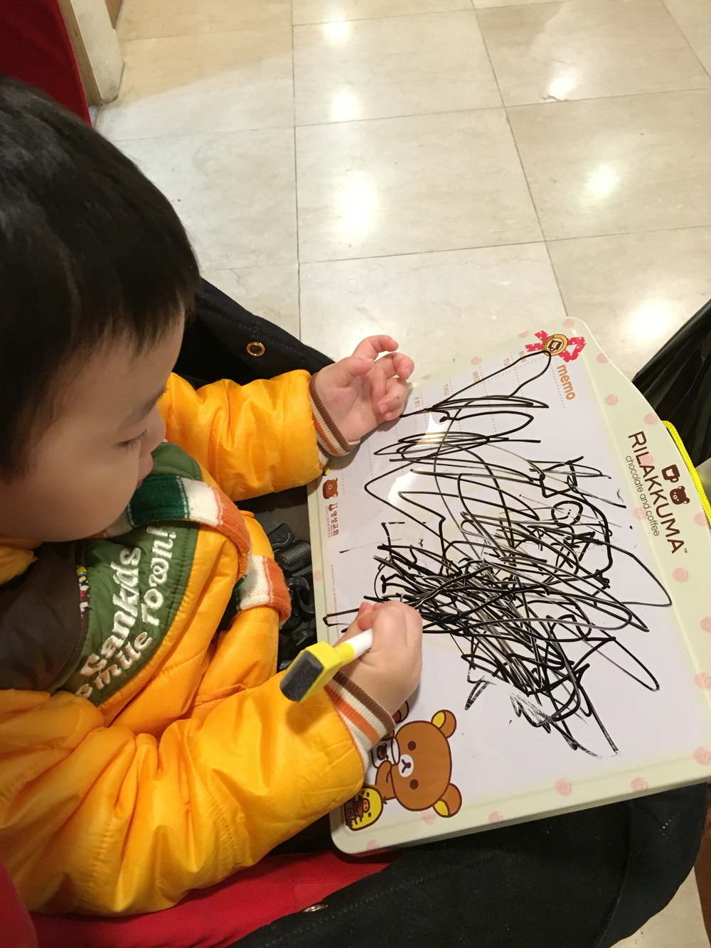 여튼 20분 정도 앉아있다나 "내가 네가"라며 나가자며 보채는 너를 유모차에 앉혀놓고 예배 마저 드릴라고 아빠가 복도 화장실 앞에다가 너를 세워놨단다 오늘은 부활절이라 교회학교에서 이것저것 줬는데 낙서 칠판 요고 참 좋아했단다 너는 이것을 가지고 멋진 '세계지도 (world map)'를 그리는 것을 보고 아빠는 네 안의 예술혼을 느낄수 있었단다 티현아 미대는 음대보다 돈이 적게 든다고 하더구나 고맙다