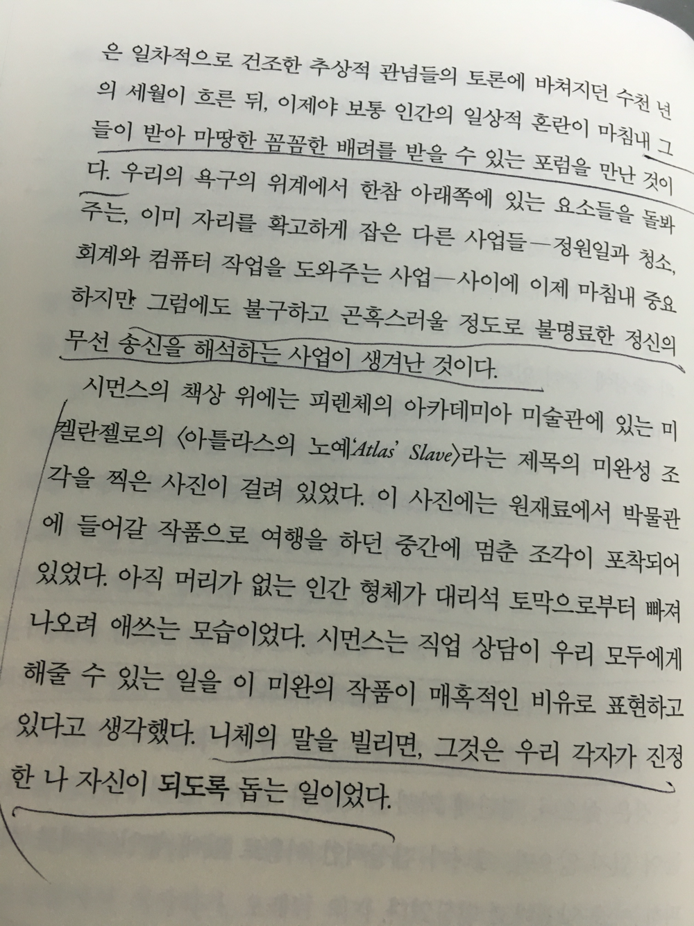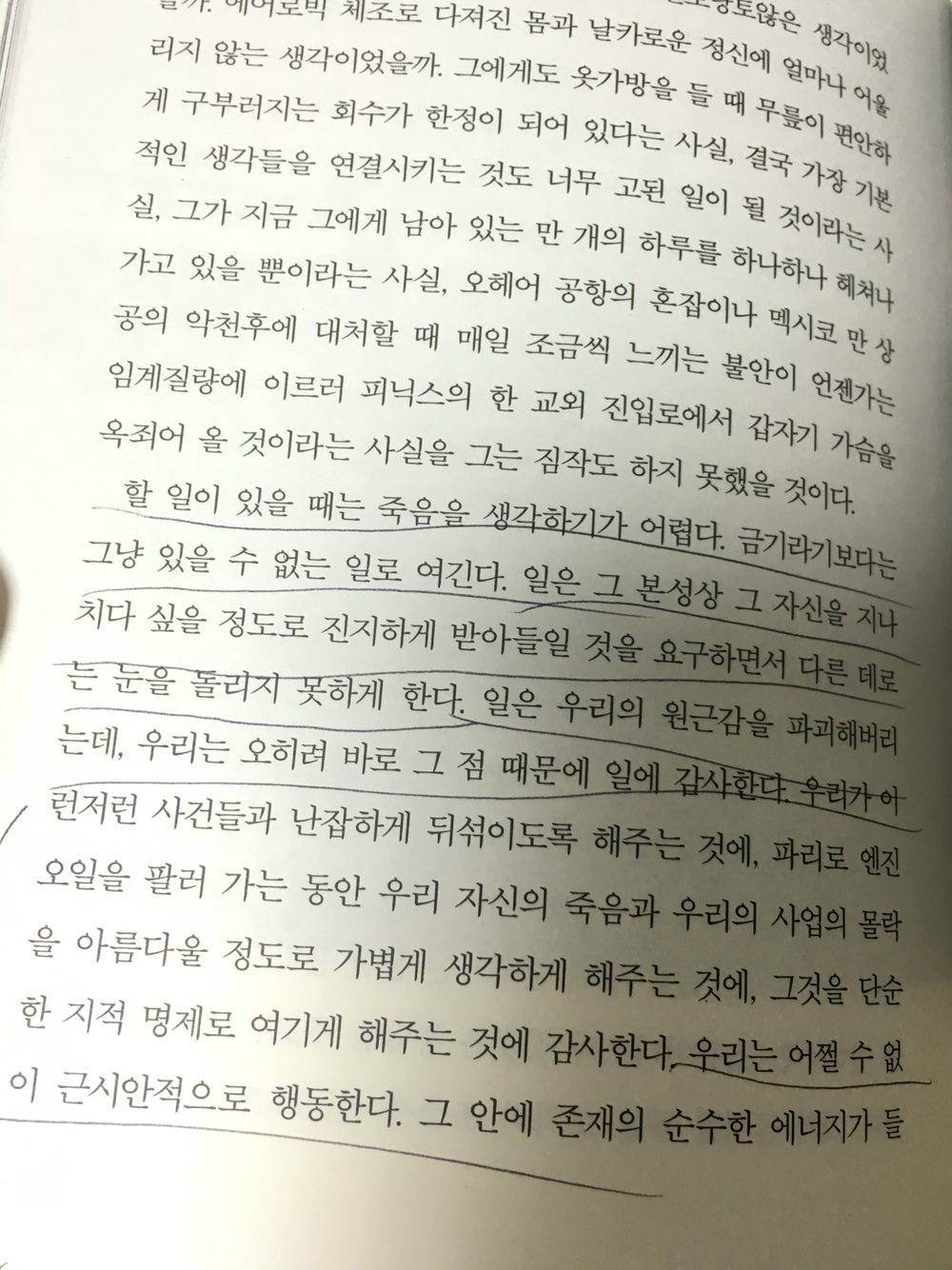 이 책에 대해서 무언가 왈가왈가 떠드는 것 자체가 쓸데없는 짓 아닐까? 꽤 오래전 서울 삼성동의 한 스타벅스 매장에서 점심시간도 포기해가며 흥겹게 읽어내려갔던 기억과 추억을 갖고 있는 책이다. 최근 브런치 글쓰기 주제를 'Work'에 맞추고 나서 가장 먼저 떠오르는 책 또한 바로 이것이었다. 물론, 다음으로 다시 읽을 책은 <불안>이다.