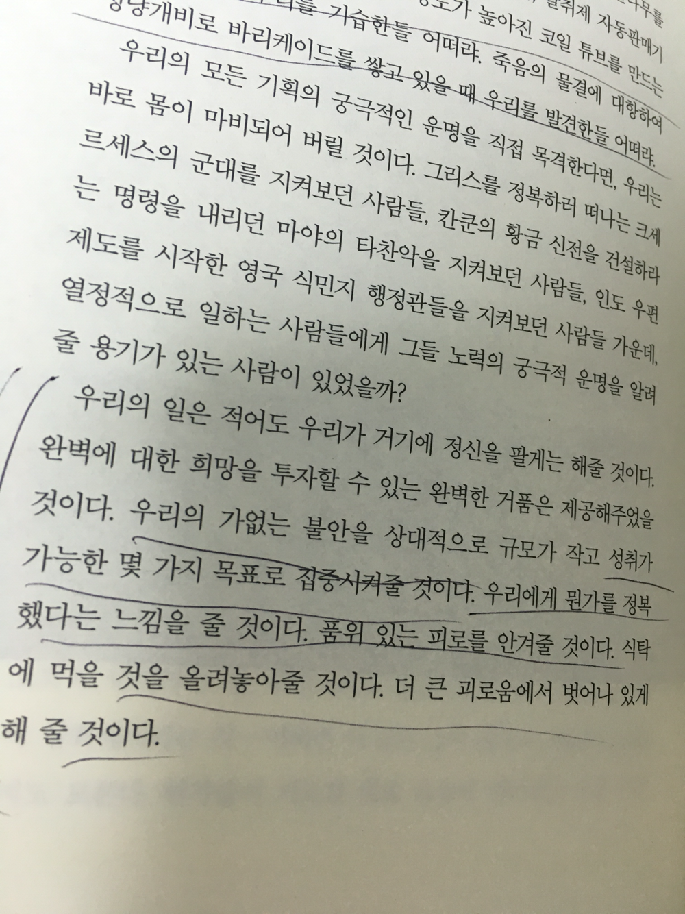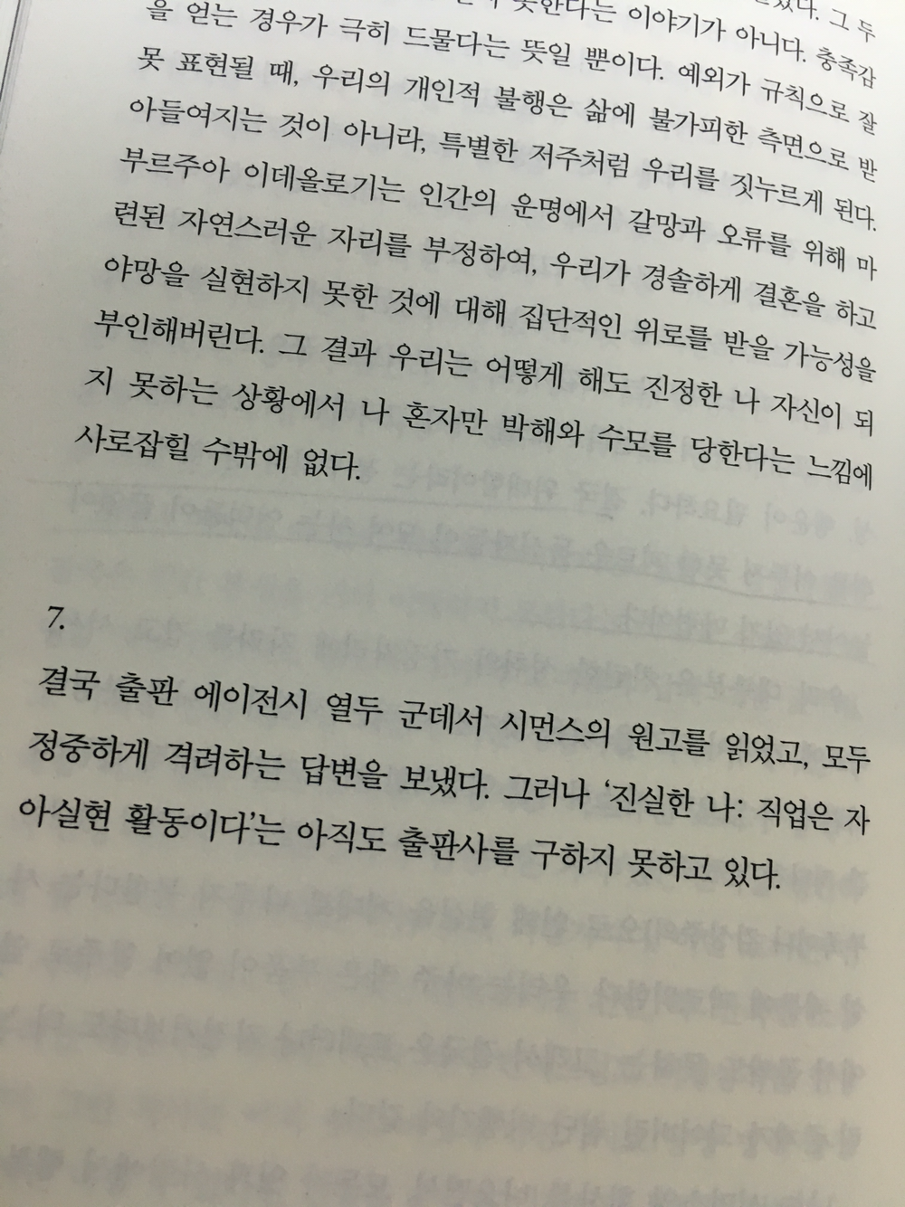 우리의 일은 적어도 우리가 거기에 정신을 팔게는 해줄 것이다. 완벽에 대한 희망을 투자할 수 있는 완벽한 거품은 제공해주었을것이다. 우리의 가없는 불안을 상대적으로 규모가 작고 성취가 가능한 몇 가지 목표로 집중시켜줄 것이다. 우리에게 뭔가를 정복했다는 느낌을 줄 것이다. 품위 있는 피로를 안겨줄 것이다. 식탁에 먹을 것을 올려놓아줄 것이다. 더 큰 괴로움에서 벗어나 있게해 줄 것이다.