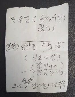 + 제가 결혼 전에 다녀왔는데 토박이 분께 여쭤봤더니 친절히 적어주셨어요. 어직 쪽지를 가지고 있어서 사진으로 보냅니다. 갈치조림은 그 날 휴일이어서 맛보지 못했어요. 허름한 식당이에요. 동성수산은 관광객보다는 제주도 분들이 많이 찾는 곳이고요.