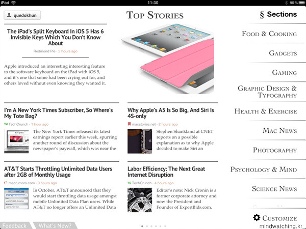 제가 해외 최신 정보를 수집하는 데 즐겨 쓰는 앱입니다. Flipboard보다 뒤에 나왔고, 인지도 면에서는 떨어지지만, Flipboard와는 기능면에서 뚜렷하게 차별점이 있습니다. 관심 주제를 키워드로 해서 자기만의 Section을 만드는 기능이 아주 훌륭합니다. 그리고 맘에 드는 기사에 like를 해주면, 그 다음부터는 내가 좋아할 만한 기사 위주로 찾아주는 똑똑한 넘입니다. 다만, 찾아주는 기사들이 거의 다 영어기사라는게 조금 아쉽죠. 한국어 기사도 Zite 처럼 찾아줄 수 있는 앱이 나오기를 기대합니다.