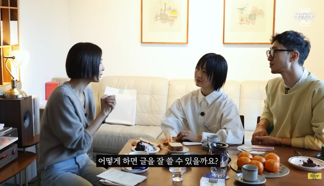슬아: (편지는) 쓰기 전부터 시작되는 것 같아요. 그냥 그 사람을 얼마나 디테일하게 봤는가. 다른 사람이 놓쳤던 디테일을 쓸 수 있는 게 (편지의) 재료잖아요. 그리고 사실 재료는 다 타인한테 있는 것 같아요. 그리고 그 사람도 잊고 있던 ‘네가 그랬었잖아.’ 그때 너 진짜 소중했어. 너 진짜 특별했어.’를 말해주는 게 편지 같기도 해서..