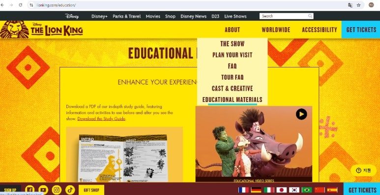 뮤지컬 라이온 킹 홈페이지에 들어가 about -> educational materials를 클릭하면 40페이지 분량의 무료 스터디가이드(영어)가 제공된다. 공연전체의 줄거리도 장면 요약이 되어있어 영어공부자료로도 활용해도 좋겠고 공연 내용을 이해하는데 도움이 될 수 있겠다. 아이들과 함께 공연을 본다면 관람전후에 부모님과 함께 할 수 있는 교육적이고 창의적인 프로젝트 활동들이 친절하게 안내되어 있다.
