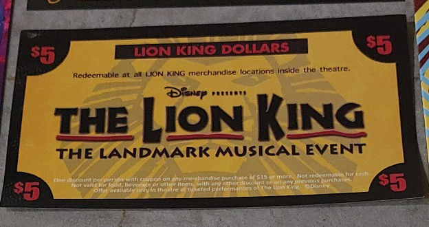 라이온 킹 공연장 박스오피스에 가면 구할 수 있는데 공연장 내에 있는 기념품샵들에서 사용가능하다. 15달러 이상 구매 시 적용된다.