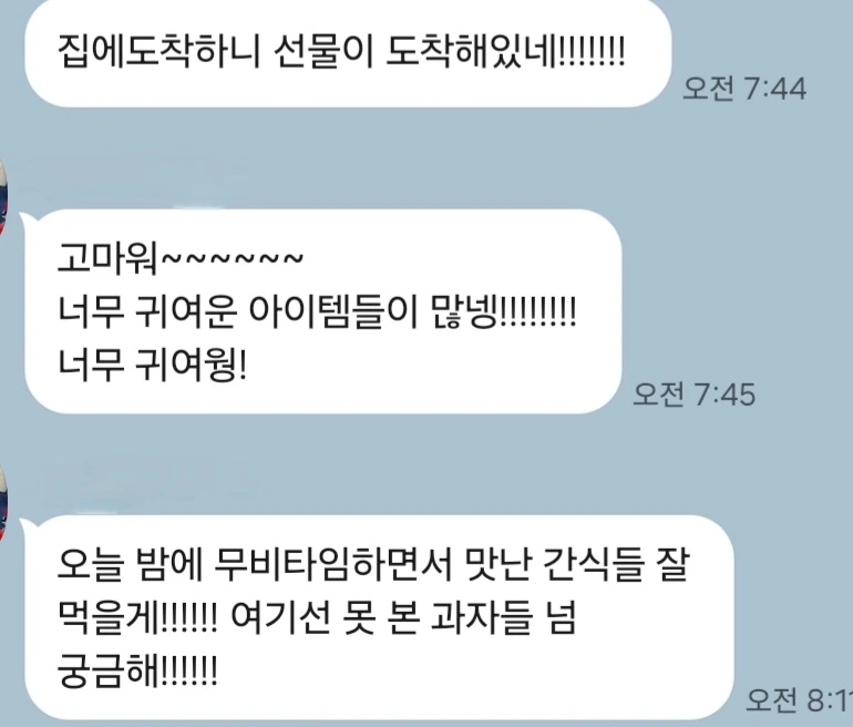 한국에 돌아온 나는 언니집에 머무는 동안 알게 된 가족의 소소한 습관과 특징을 기억해 내며 며칠을 고심해 소소한 크리스마스 종합선물세트를 만들었다. 선물 하나하나를 정성스럽게 포장하며 함께하지 못했던 지난 세월에 대한 애잔한 마음을 담아 소포를 부쳤다. 선물은 센스 있게 크리스마스이브날 도착해 주었고 "이모 캄사합니다~" 콧노래를 부르며 색칠공부책에 색을 입하는 조카의 영상을 몇 번이나 돌려봤는지 모른다.