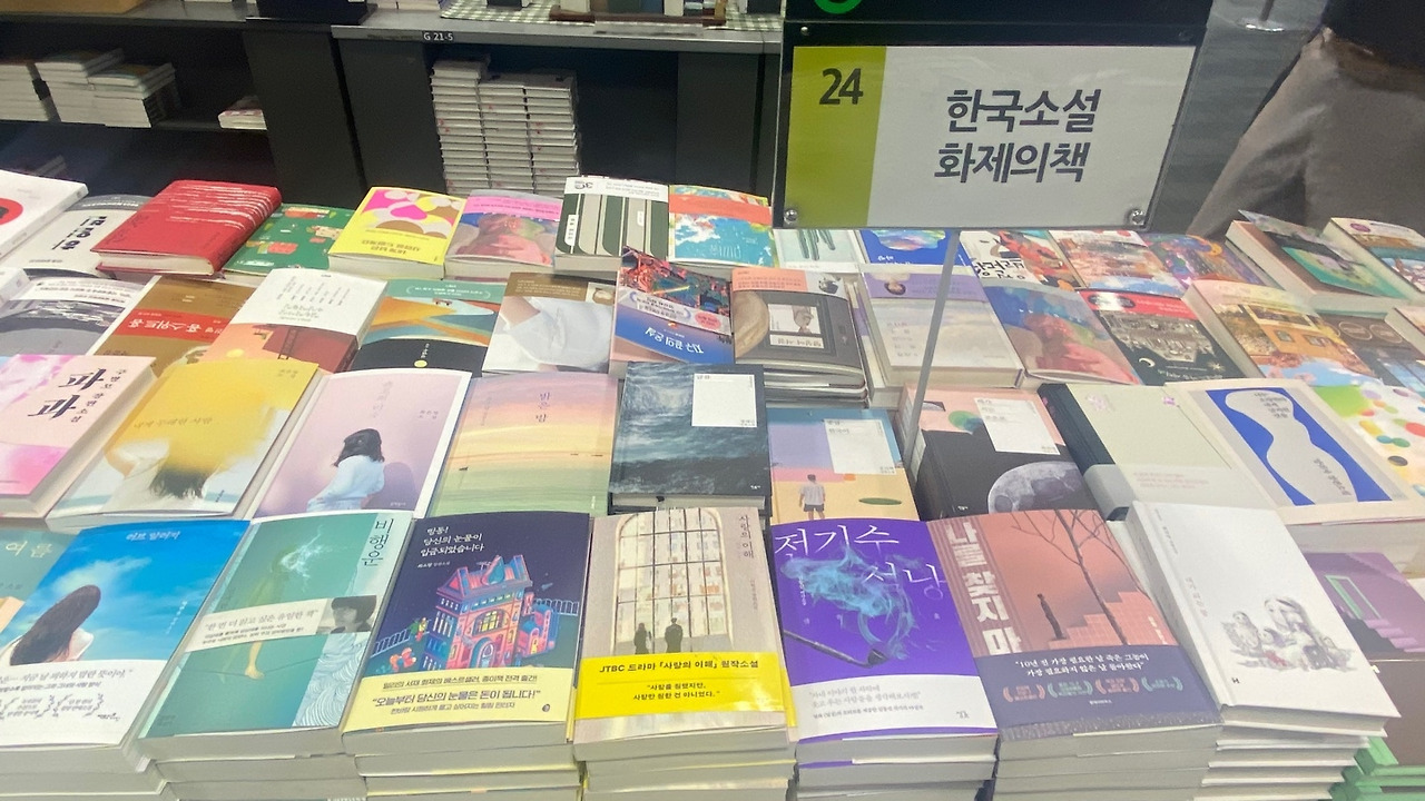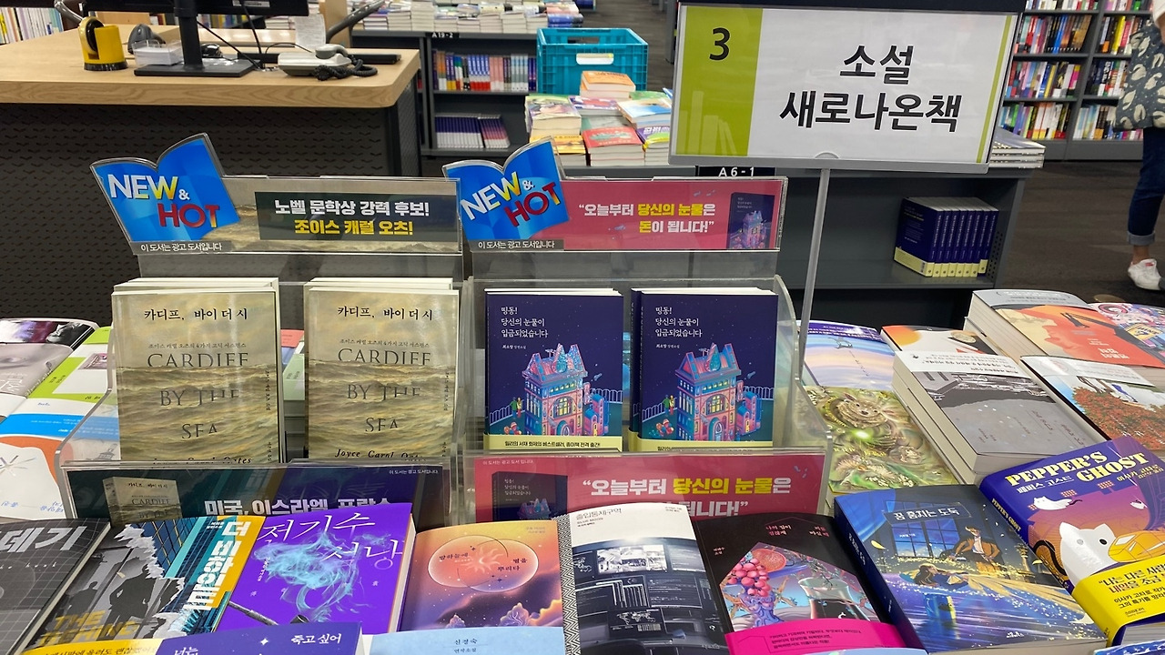 강남점은 우선 한국소설 화제의 책 자리에도 예쁘게 놓여 있었고요. 신간 소설 자리에도 핑크색 배너와 함께 눈에 잘 보이는 곳에 있었습니다.
