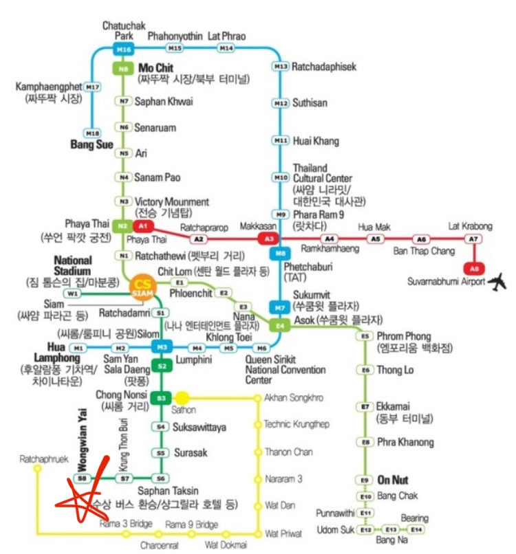대부분 방콕을 여행하는 사람들은 카오산로드나 방콕 왕궁, 왓 아룬 사원, 쇼핑의 메카인 아이콘시암이나 아시아 티크를 들린다. 하지만 나는 검색창에 입력하면 1,2번째로 나오는 유명한 곳보다는 남들이 잘 모르는 곳에 가고 싶었다. 그래서 내가 들린 지역이 바로 왼쪽 하단에 별표가 그려져 있는 Wongwian Yai 역이었다.