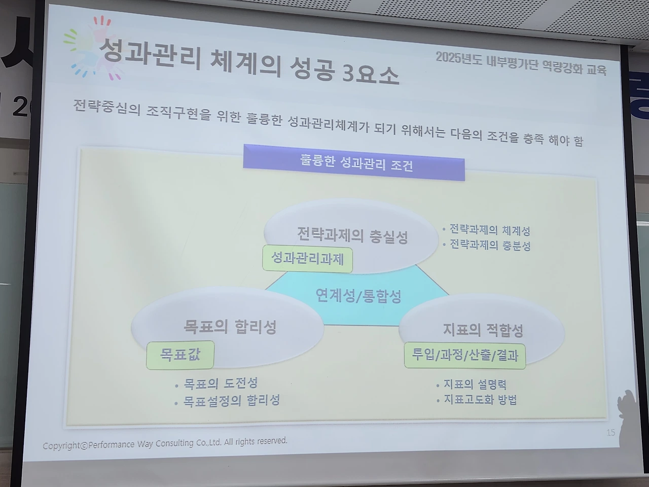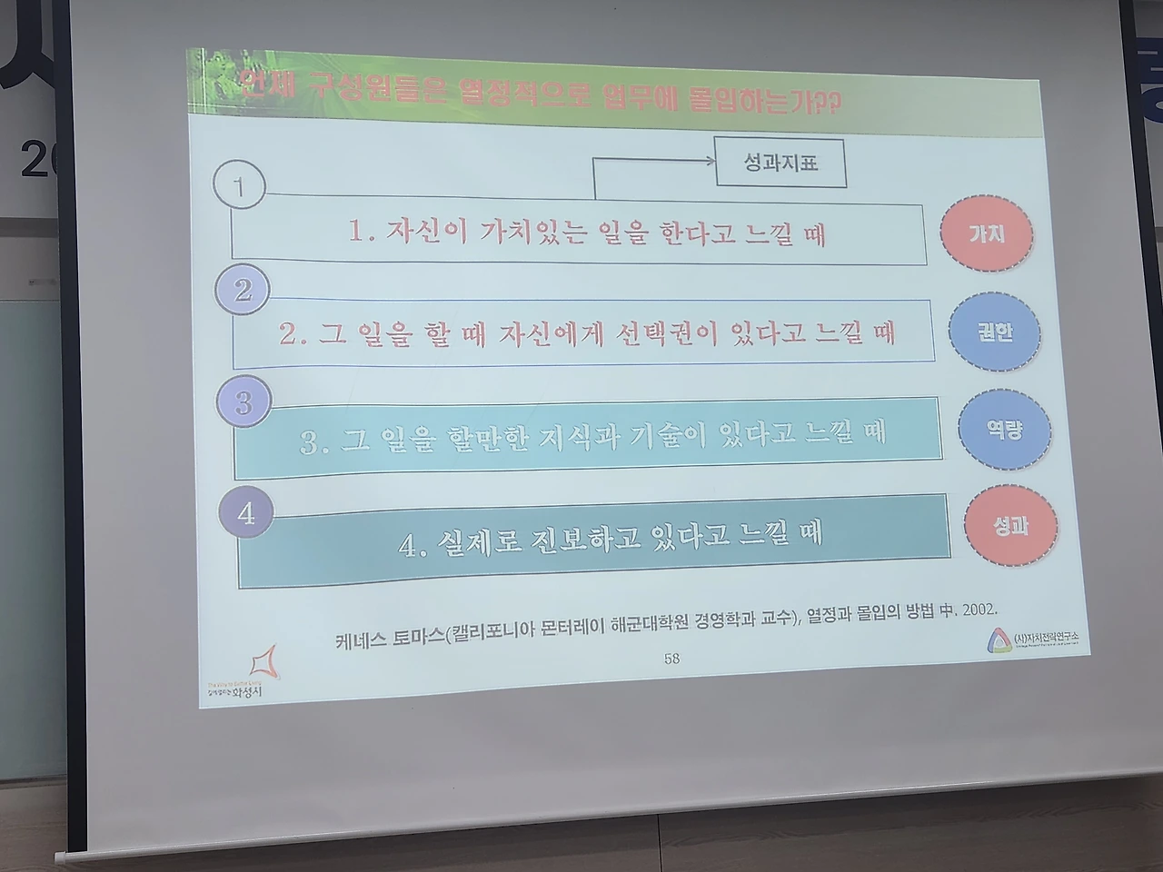 교육장에 가보니 평소 적극적으로 일한다고 생각했던 멋진 팀장님이 많이 보여 반가웠다. 성과관리 내부평가단 교육은 예상과 달랐다. 딱딱한 평가 기준이나 복잡한 지표 설명만 있을 거라 생각했는데 흥미로운 내용도 있었다. 특히 몰입에 대한 이야기가 인상 깊었다. 사람은 언제 일에 몰입하는지, 어떤 조건에서 최고의 성과를 내는지에 대한 통찰이었다.