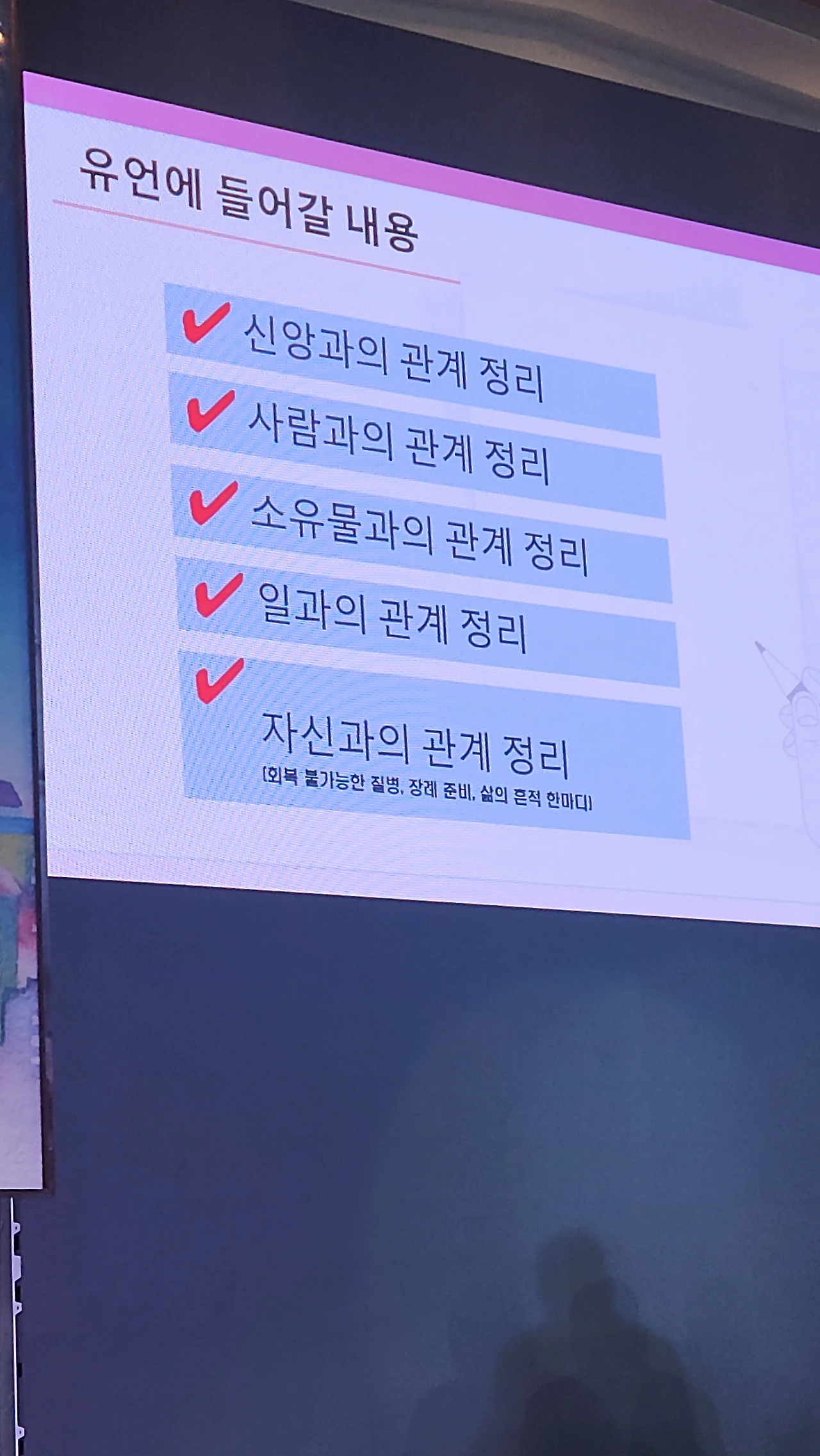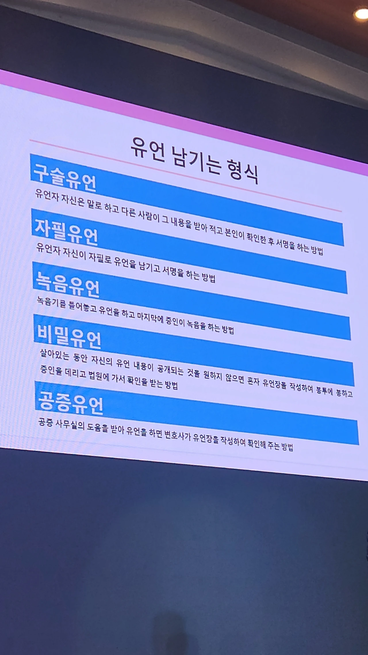 이사장님의 강의에서 가장 인상 깊었던 부분은 '유언을 미리 남기는 유익'에 관한 이야기였다. 우리는 종종 유언을 법적인 문서, 혹은 남은 이들을 위한 분쟁 예방책 정도로 여긴다. 하지만 유언은 그 이상이다. 사랑하는 사람들에게 전하고 싶은 말, 미처 풀지 못한 감정, 고마움과 미안함, 그리고 삶의 마지막에서 나누고 싶은 한 줄의 지혜. 이런 것들을 솔직하게 남기는 일은, 남은 이들에게 커다란 위로와 용기가 된다. 때로는 미처 말하지 못한 한마디가 남겨진 가족의 인생을 바꾼다.