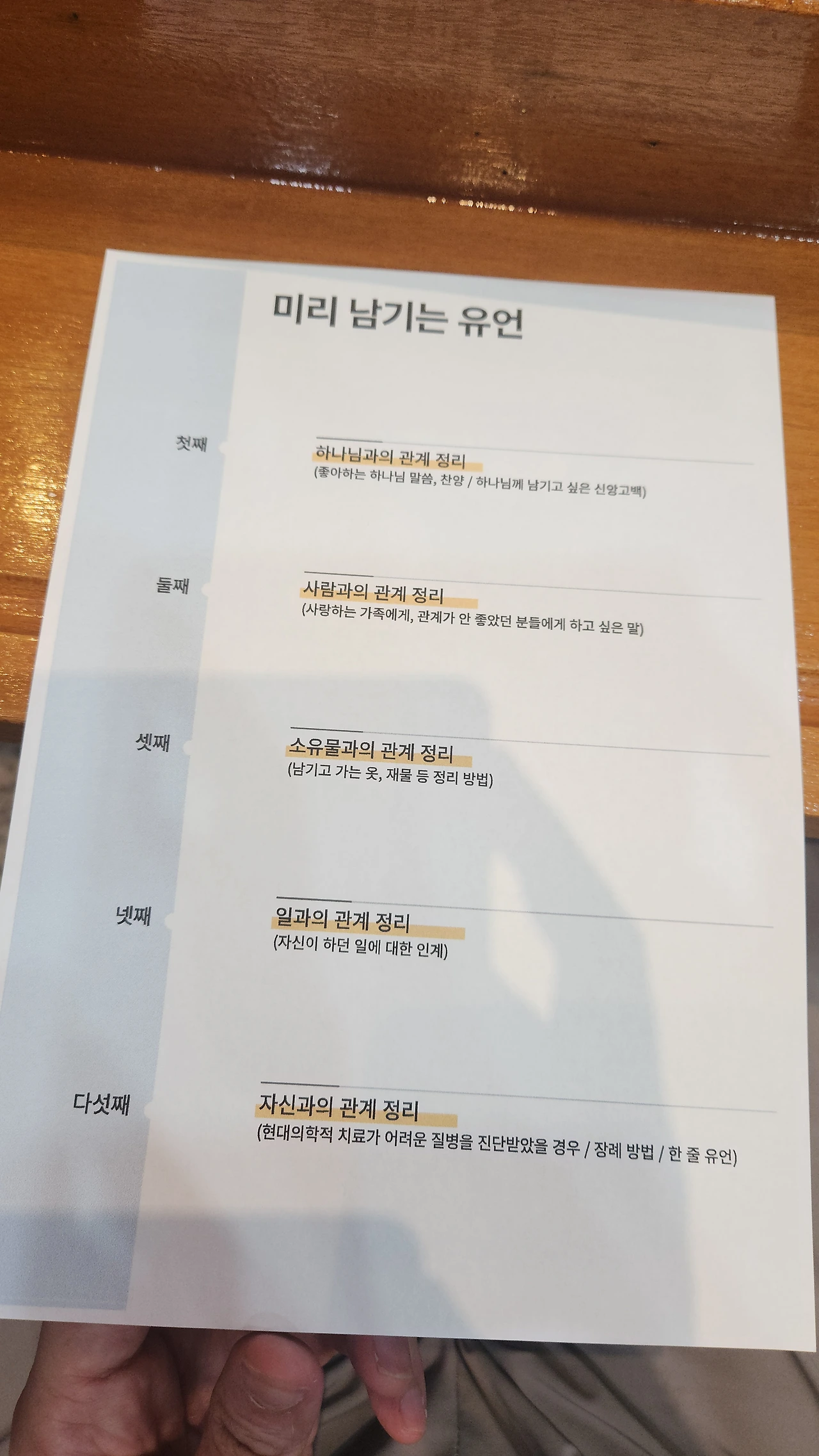 유언은 살아있는 동안 쓰는 사랑의 편지다. 죽음 이후에도 계속해서 사랑하는 이들의 마음에 스며들어, 그들의 어려운 순간마다 등불이 되어줄 말들이다. 유언은 모든 걸 정리하게 만드는 수단이다. 일반적으로 유산을 떠올리지만 그것은 단순한 재산 분배가 아니라, 한 인간이 평생에 걸쳐 쌓아 온 사랑과 지혜의 결정체다. 나는 기독교인으로서, '신앙의 유산'을 남기는 것이 중요하다고 생각한다. 하지만 그것이 믿음이 없는 사람들에게도 '내 삶이 어떤 의미였는지, 무엇을 사랑하고 두려워했는지, 남겨진 이들에게 진정으로 바라는 것이 무엇이었는지'를 전할 수 있는 따뜻한 인간의 언어로 담겨야 한다고 믿는다.