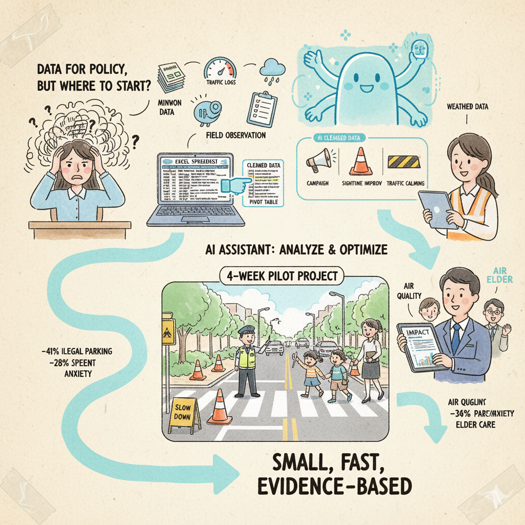 시 전체가 아니라 3개 학교, 4주 기간으로 시작했지만 41퍼센트 민원 감소라는 명확한 결과를 냈어요. 크게 시작할 필요 없습니다. 작게 시작해서 효과를 보여주고, 그다음 확대하면 돼요.