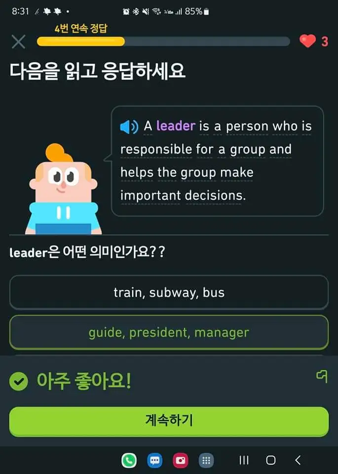 일 년 전 생일식사 자리에서 형의 추천으로 시작한 듀오링고가 벌써 1년이 됐다. 듀오링고는 다양한 외국어를 배울 수 있는 앱으로 영어는 물론이고 소수 언어도 배울 수 있다. 게다가 무료로 사용이 가능해서 하루 중에 짬이 날 때마다 틈틈이 하고 있다.