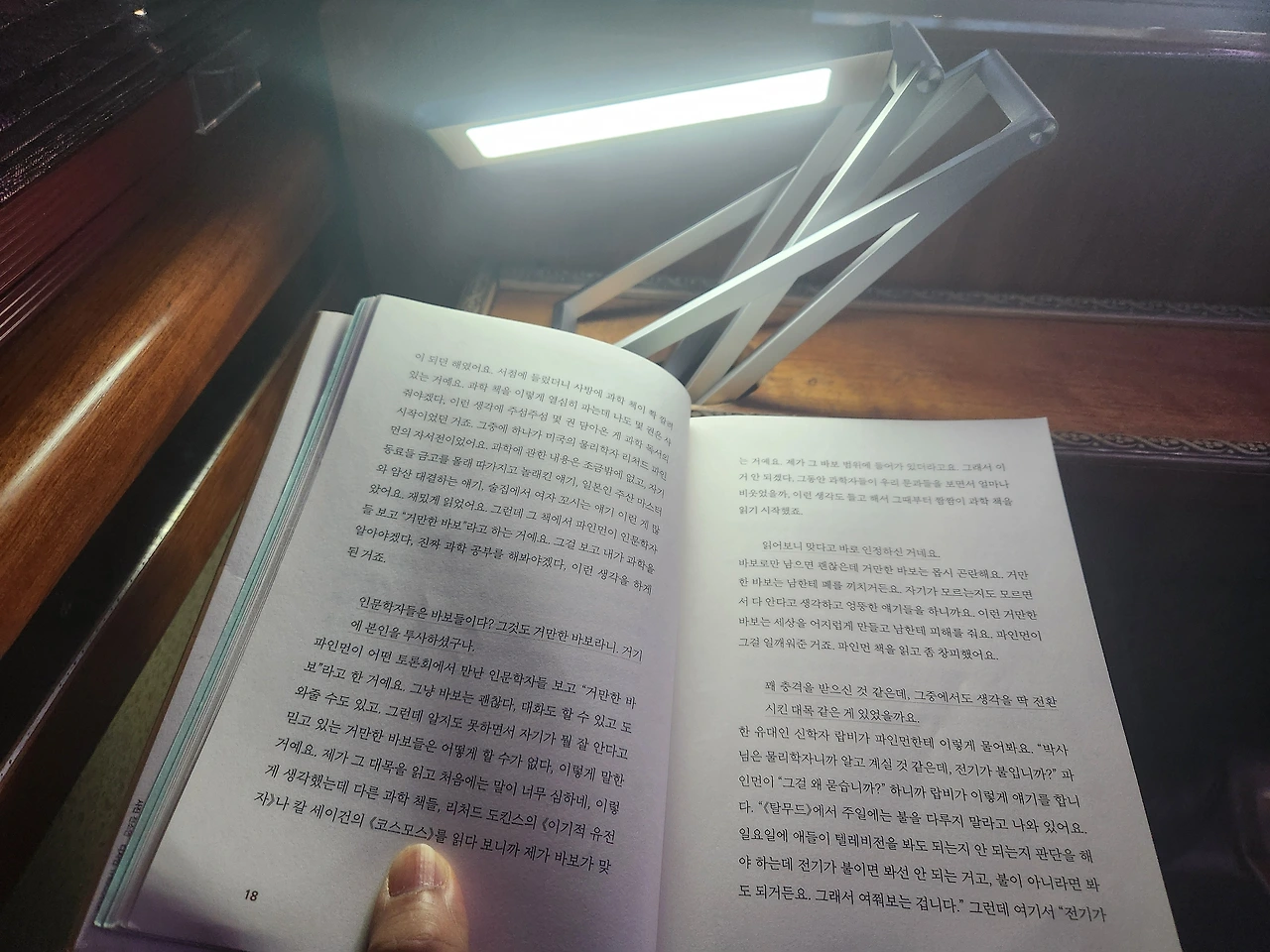 그러던 어느 날이었다. 마법 같은 물건을 발견했다. 관절처럼 자유자재로 휘어지는 무선스탠드였다. 가격도 착했다. '이거다!' 싶어서 바로 주문했다. 오늘 처음으로 그 스탠드를 켰다. '강원국의 인생공부' 책을 펼쳤다. 불빛이 참 좋다. 내 책만 살짝 비추는데, 딱 읽기 좋은 밝기다. 게다가 옆자리 승객의 단잠도 방해하지 않는다. 마치 도서관에서 혼자만의 공간을 가진 것 같은 기분이다.