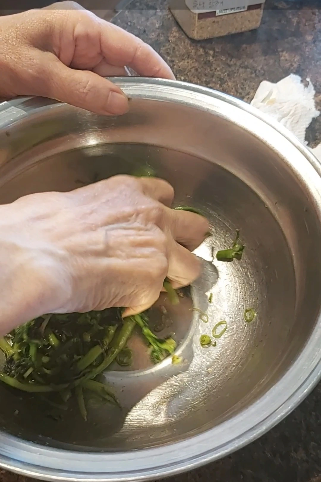 나물류는 시간이 걸리더라도 간격을 두고 재료와 양념을 순서대로 섞어가는 게 중요하다. 그녀의 나물을 무치는 모습은 뭐든 한 번에 때려 넣고 요리를 빨리 끝내 버리려는 내 자세를 반성하게 했다. '맛은 정성이라던데... 맞네~, 나물은 정성과 사랑이지~, 엄마의 손맛! '