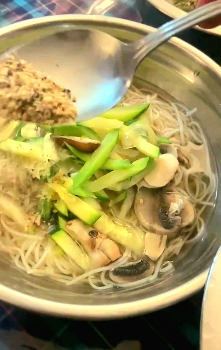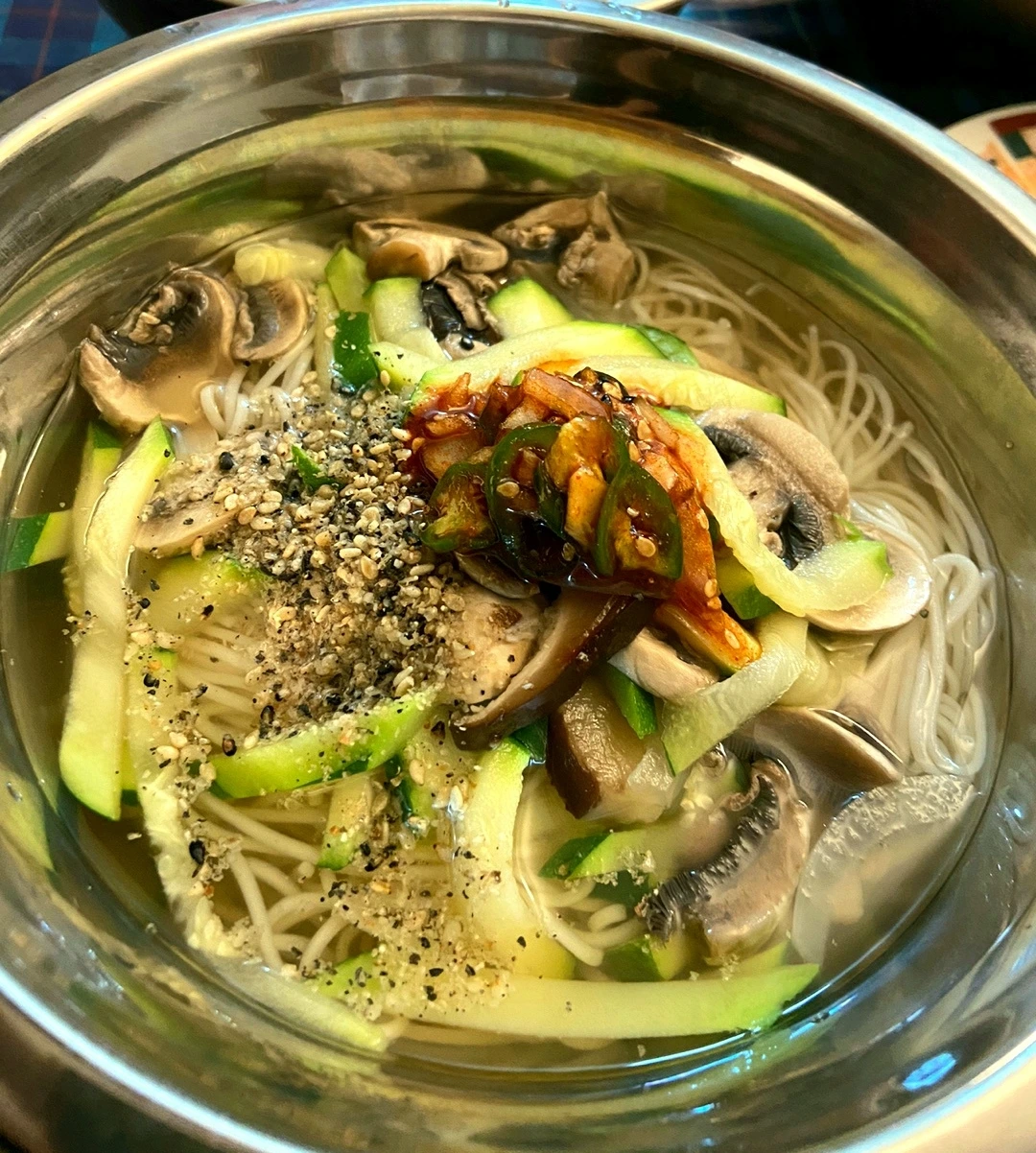 그녀의 육수에는 굵직하게 채 썰은 애호박과 버섯 양파가 이미 섞여 있었다. 그것도 듬뿍.