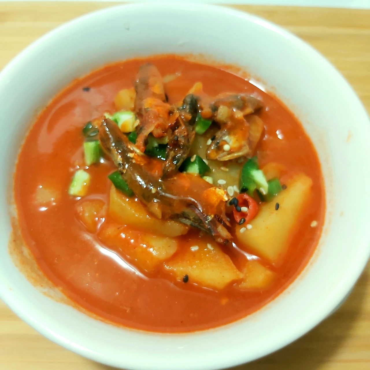 드디어 칼칼하고 구수한 감자 고추장찌개가 완성되었다. 냄비째 식탁으로 가져와 이미 때 늦은 식사를 시작했다.