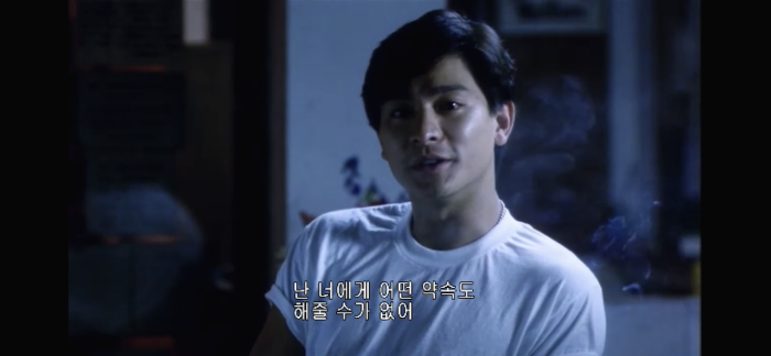 포털에서 열혈남아를 검색하면 역시 드라마 혹은 범죄 장르로 소개된다. 하지만 영화 전반을 관통하는 배경이 범죄 세계임에도 불구하고, 나는 이 영화가 철저하게 로맨스임을 고집하겠다. 폭력으로 빚을 회수하거나 조직원 간 갈등과 협박이 계속되는 장면들 틈에, 남겨진 여자 '아오(장만옥 분)'가 있다. 아화는 처음 아오에게 사랑의 감정을 전하며, 먹먹하게 말한다.