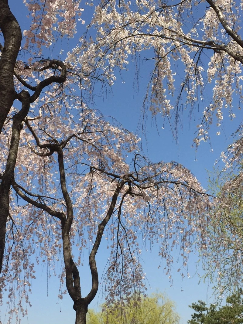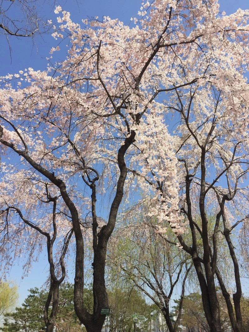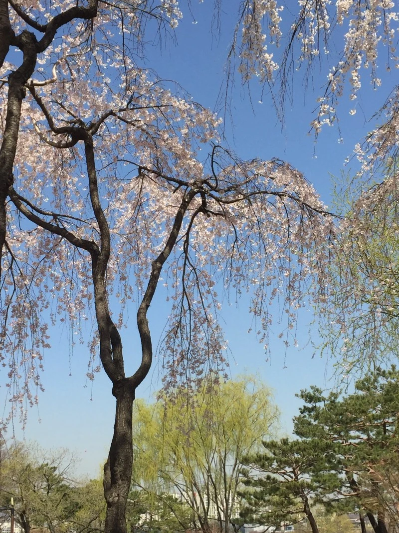 하늘과 연초록 버드나무, 그리고 벚꽃까지 완벽한 조화 아닌가요?
