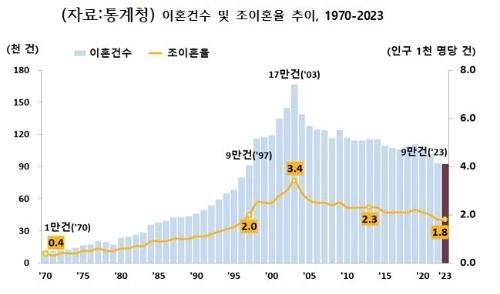 대한민국 불륜은 ‘이혼’에 대한 심리적 거리감이 줄어든 세태로도 확인할 수 있다. 통계청 ‘혼인·이혼 통계’ 자료에 따르면, 국내 이혼건수는 1990년대 중후반을 기점으로 매년 최소 9만건 이상을 기록해 왔다....(하략)....