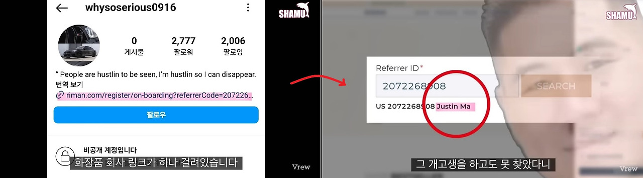 유튜버 ‘샤무’는 인스타그램 계정 sgv joker에 링크돼 있는 한국 화장품 회사 ‘리만’ 홈페이지에 추천인 아이디로 나오는 ‘Justin Ma’라는 이름이 그의 본명이라고 추정했다. 사람 찾기 사이트를 통해 와칭 근거지 ‘샌 가브리엘 밸리’에 ‘Justin Ma’라는 1987년 9월생 남성이 존재한다는 근거도 곁들였다. 인스타그램 계정 sgv joker의 아이디 ‘whysoserious0916’에 달린 네 자리 숫자(0916)가 생일이라고 본다면, 정황상 ‘Justin Ma’가 제시 팬을 폭행한 sgv joker라는 합리적 도출이 가능하다는 설명이다.