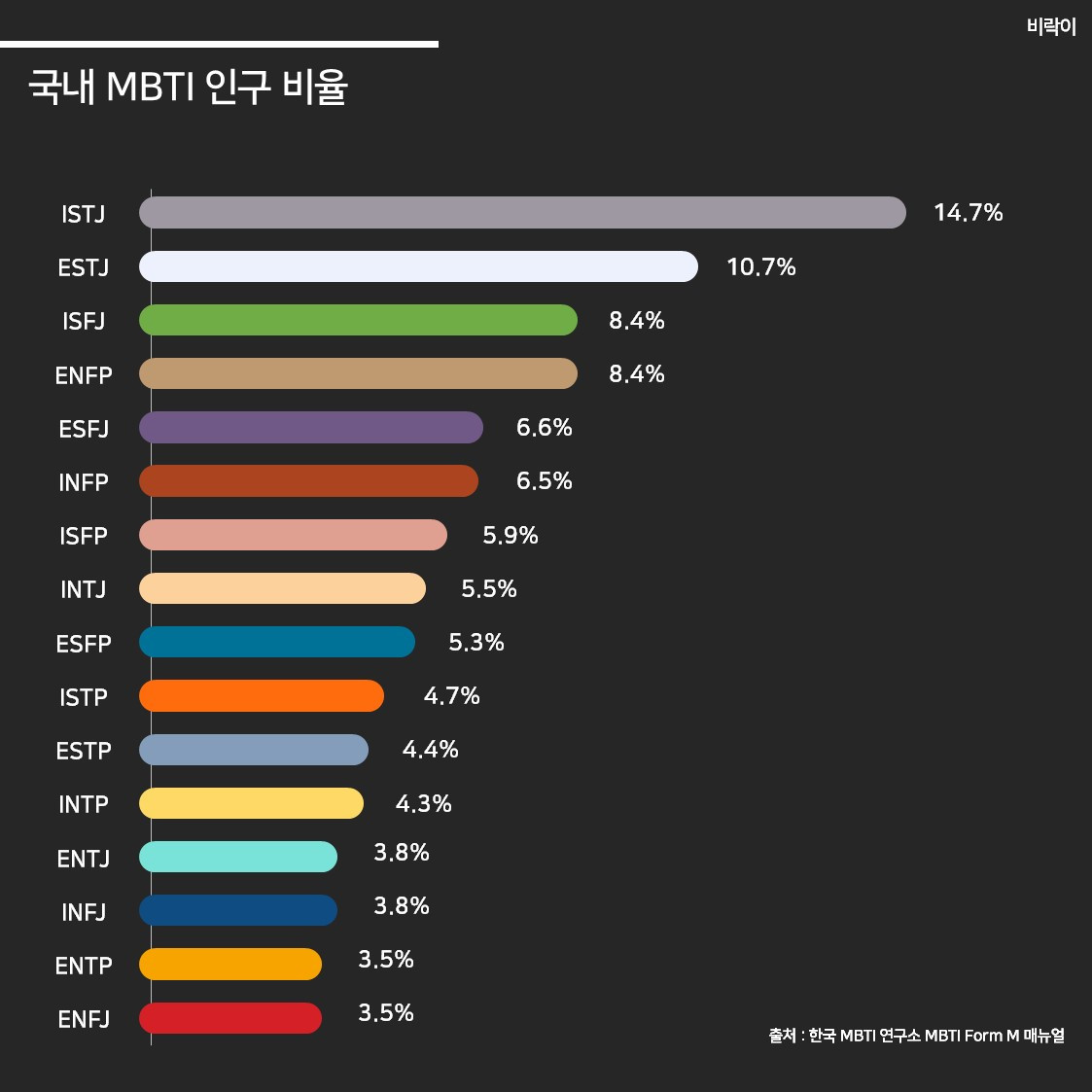 그런데 국내 MBTI 인구 비율을 보니, 웬걸? INFP가 ISTP보다 많았다. MBTI를 공부한 나도 국내에 ISTP 인구가 많을 것이라는 편협한 생각을 가지고 있었던 것이다. [물론 우리나라는 ST 기능(사실적, 실질적인 유형)이 가장 많고, 그중에 STJ는 전체 인구의 25% 이상을 차지하는 절대강자이다.]