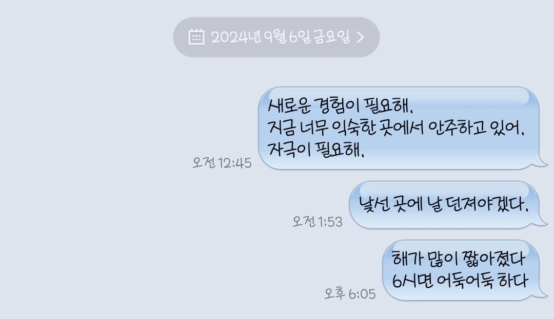 그런데 그간 시행착오를 겪어보니, '난 이런 사람이야'라고 밝히고 그냥 나답게 사는 게 좋은 것 같다. 그 편이 낫다. 사람들이 걸러진다. 진정 나다울 수 있는 사람들, 이런 나를 배려해주는 사람들을 만나는 선물 같은 일도 경험할 수 있고.