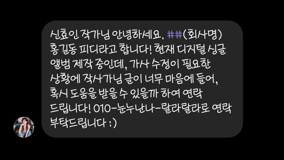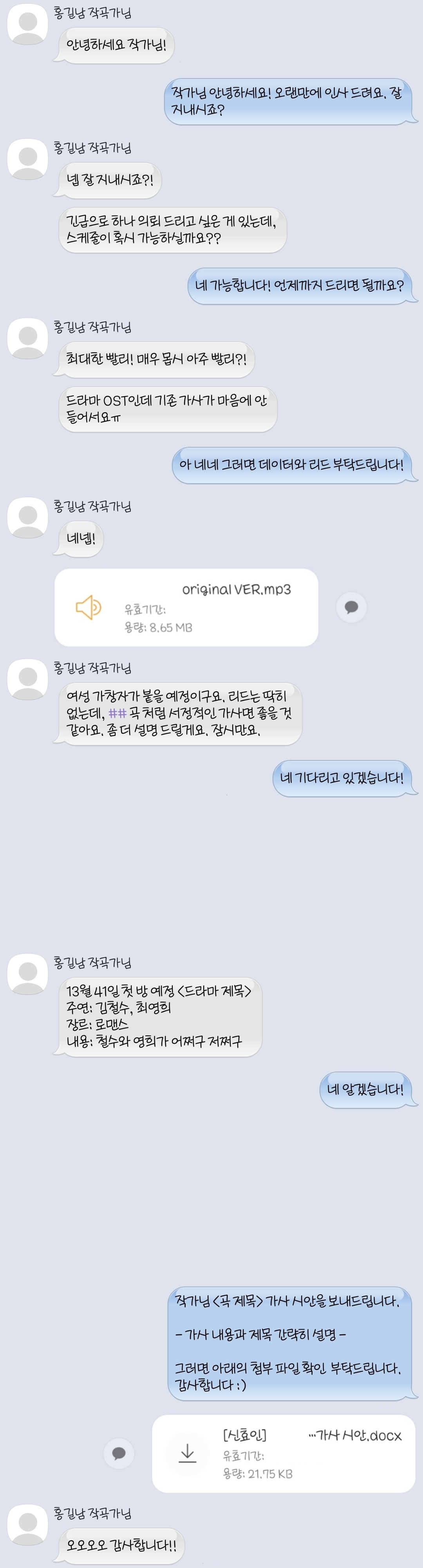 오늘은 제 경험을 바탕으로, 작사 의뢰 유형 별 응대 방법을 나눠보고자 해요. 제가 의뢰인과 실제로 주고받은 메세지를 참고해 샘플을 만들어, 글에 첨부하였습니다.