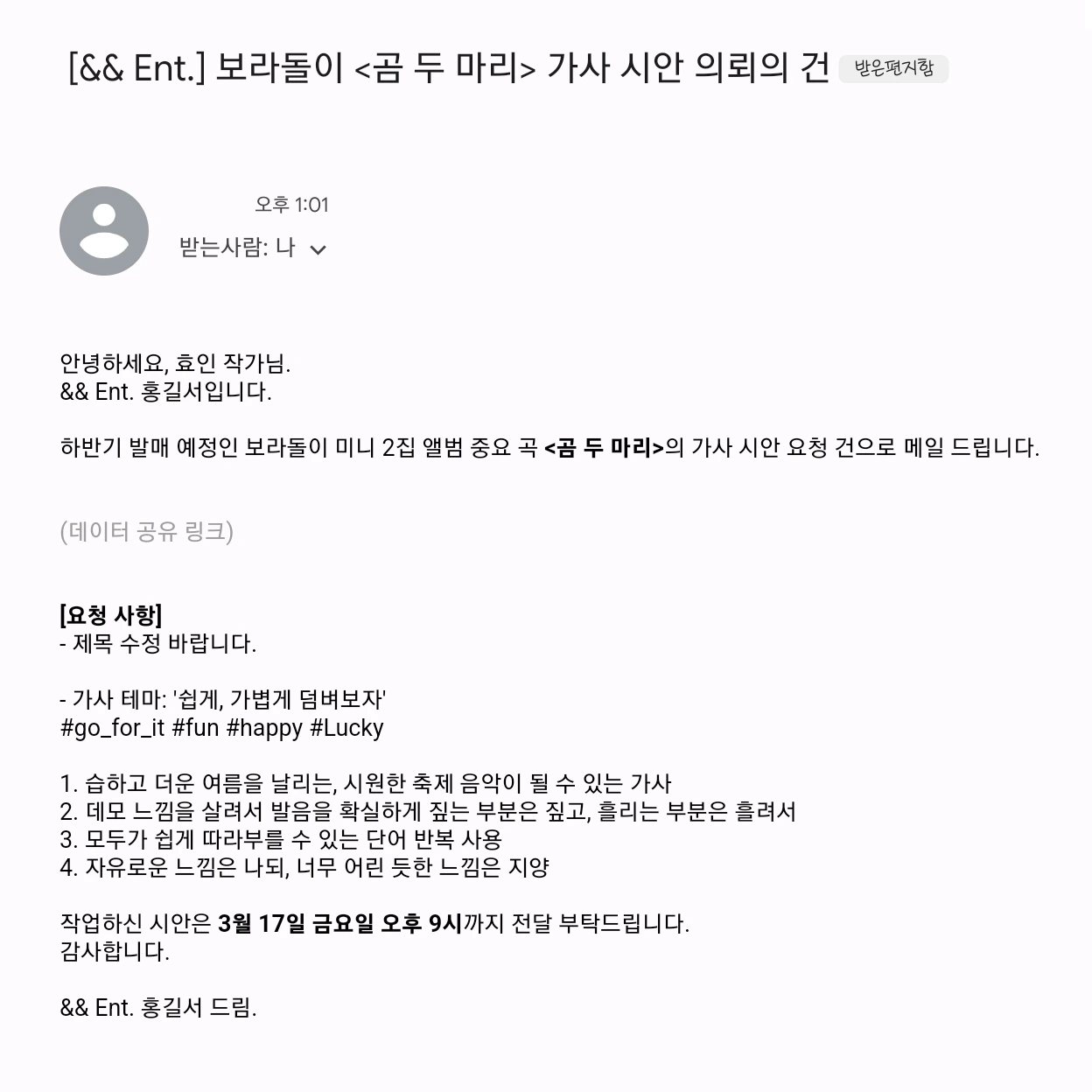 작사 학원/퍼블리셔에서 뿌리는 식으로 작가들에게 의뢰를 돌리는 이메일도 위와 유사합니다.