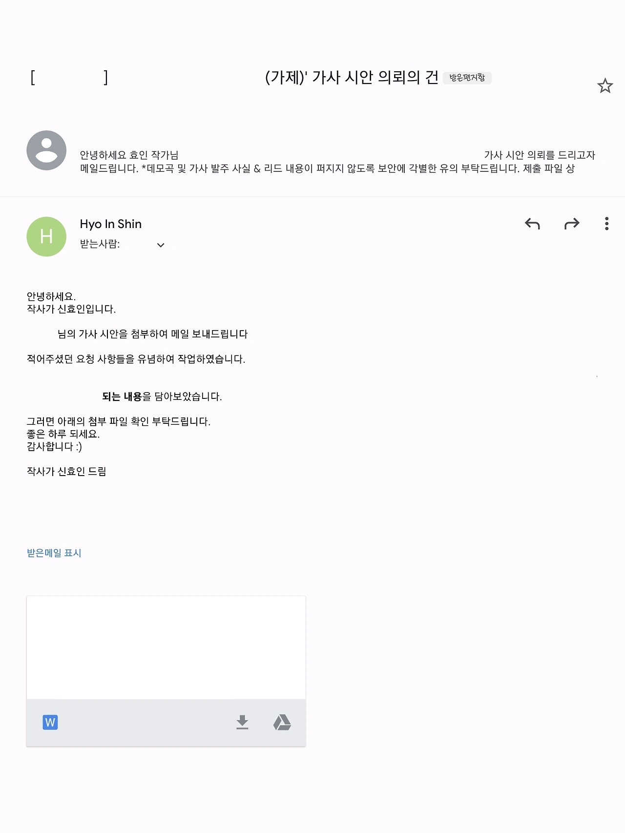 저는 시안을 보낼 때, 시안만 보내지 않아요. 구체적인 요청 사항이 의뢰 내용에 있었다면 그것들을 어떻게 반영하여 작업했는지, 자유 작업이었다면 왜 그렇게 가사를 썼는지 적어서 시안 파일과 함께 보냅니다.
