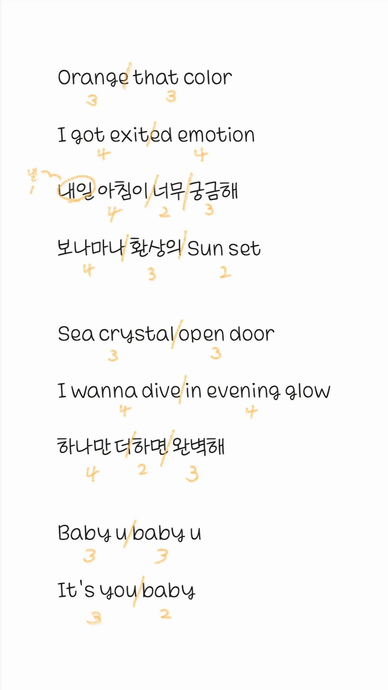 아이디어, 톤, 말투 등 가사를 쓸 때 중요한 요소들이 참 많은데요. 그중에서 오늘은 기본 중에 기본이자, 가장 중요한 '글자 수 세기'와 '띄어쓰기'에 대해 이야기할 거예요. 한국어 가사와 영어 가사를 가지고 글자 수 세기와 띄어쓰기가 '왜' 중요한 지 먼저 짚어보고(Part 1), 저의 경험-연습 방법(Part2)을 나눠볼게요.