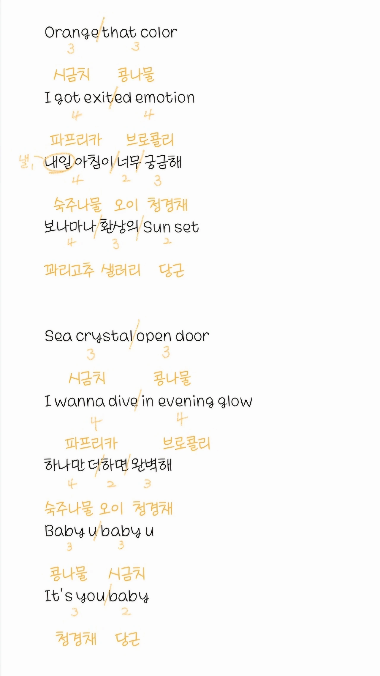 셋째 줄 '너무 궁금해'같은 경우는, 다섯 글자 자리로 봐도 무방해요. '오이 청경채'로도 잘 불리고, '청경채 오이'로도 잘 불리고, '아메리카노'로도 잘 불려요.