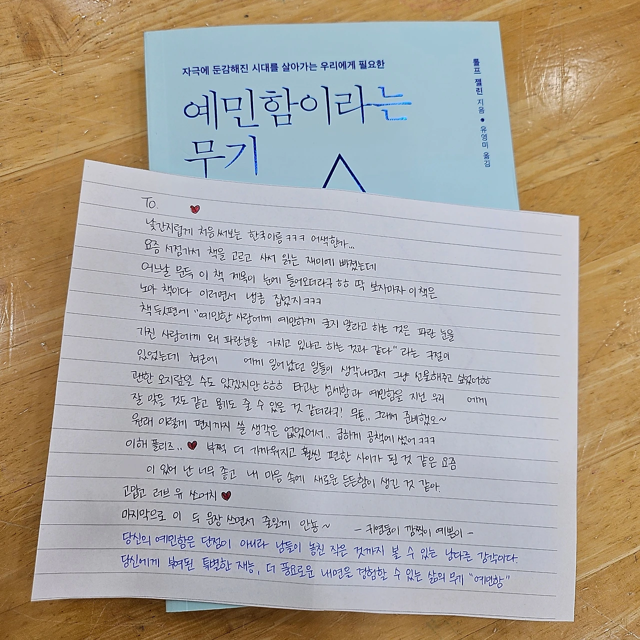 책 제목도 인상 깊었지만, 그 안에 편지가 가슴에 더 크게 와닿았다. 생각하지 못한 타이밍에, 예상하지 못한 선물과 감동을 받아서 당황스러웠던 기억이 난다.