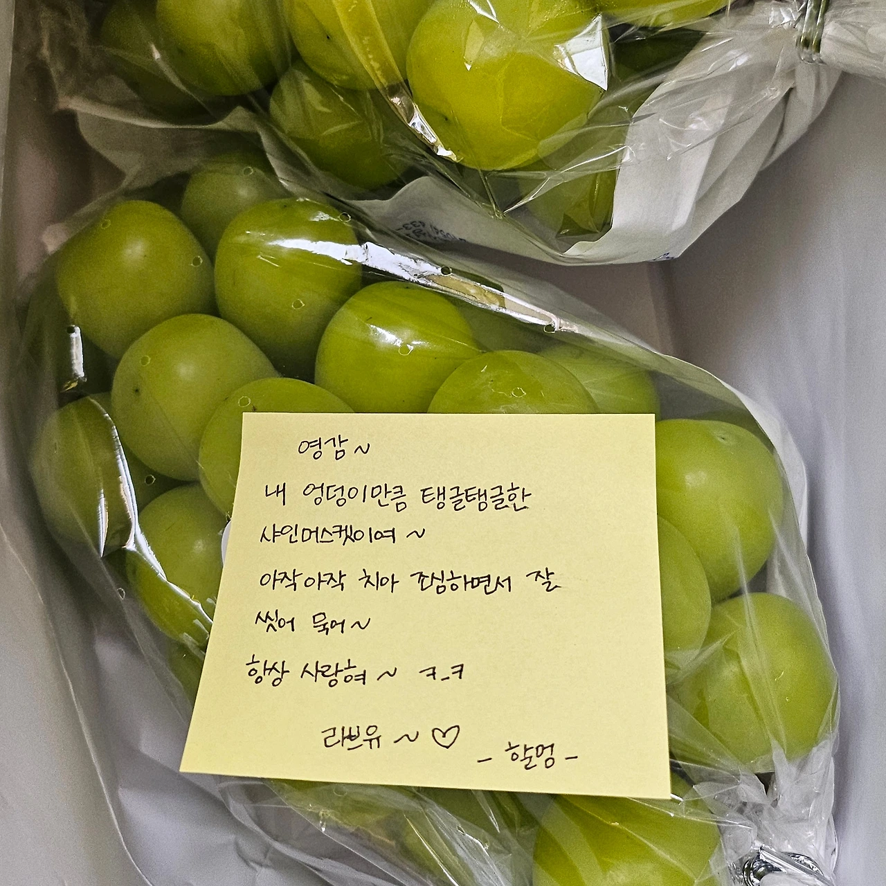 엠마는 나의 간식요정이기도 하다. 종종 집 앞에 찾아오거나 내 교실에 와서 빵, 과일, 디저트 등의 간식을 주고 간다. 보면 호두파이는 종이호일과 지퍼백으로 서툴게 포장이 되어 있고, 딸기는 씻어서 꼭지가 따여 컵에 포크와 담겨있다. 추석이라고 건네받은 샤인머스캣에는 웃음 터지게 만드는 쪽지가 붙어있었다.