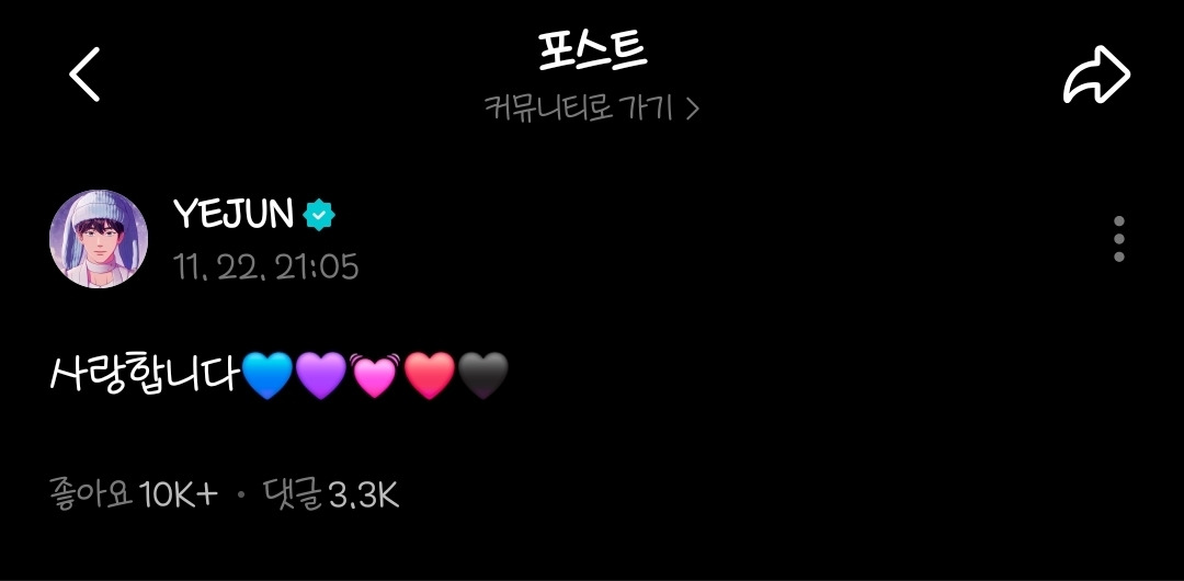 계속 이야기를 나누며 주차장으로 걸어갔다. 공연장에서 좀 멀어지니 핸드폰 데이터가 잘 터졌다. 콘서트 직후 올라왔던 예준이의 위버스 글을 동생이 그제야 확인하고서 또 울었다.