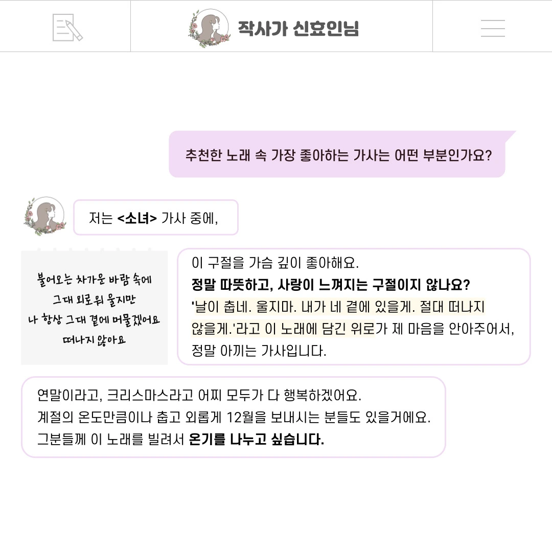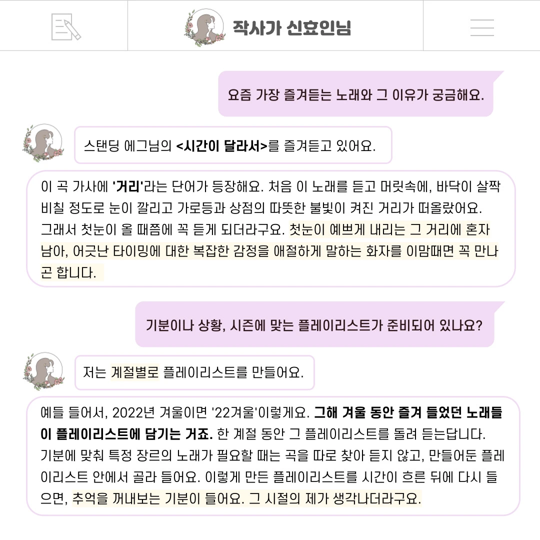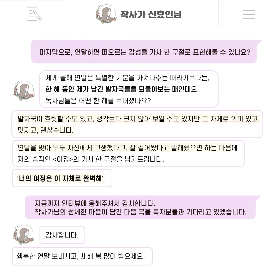 인터뷰 덕분에 올해가 다 가기 전에 작사가 신효인으로서 한 발자국을 또 남길 수 있어서 감사하고 행복했어요. 저에게 너무나도 의미 있었던 그 인터뷰를 저의 브런치 생일을 맞아, 독자님들께도 나누고 싶어요. 인터뷰 내용을 통해 독자님들과 한층 가까워질 수 있다면 더할 나위 없을 거예요ㅎㅎ