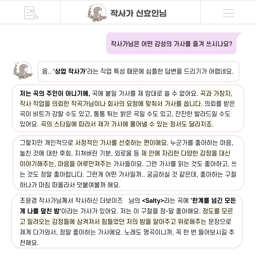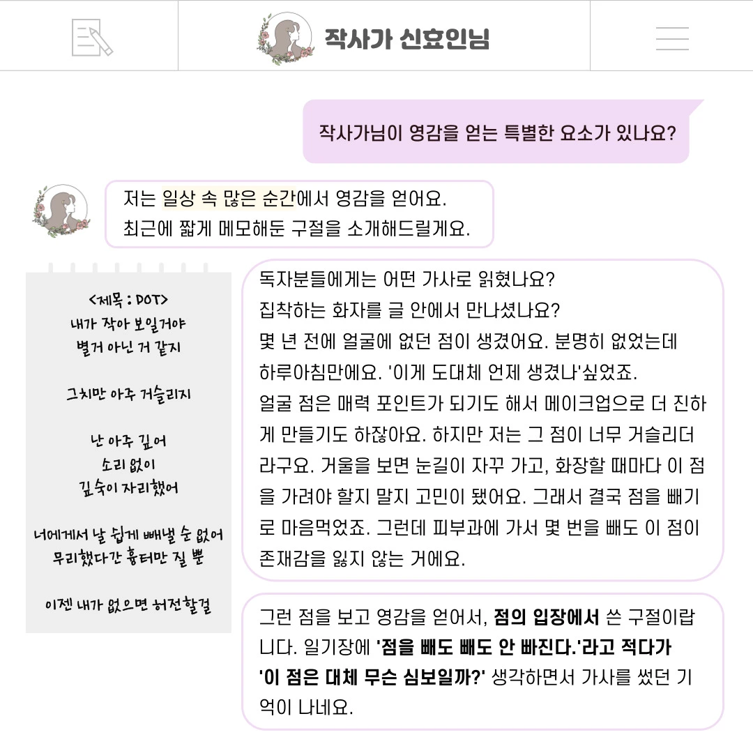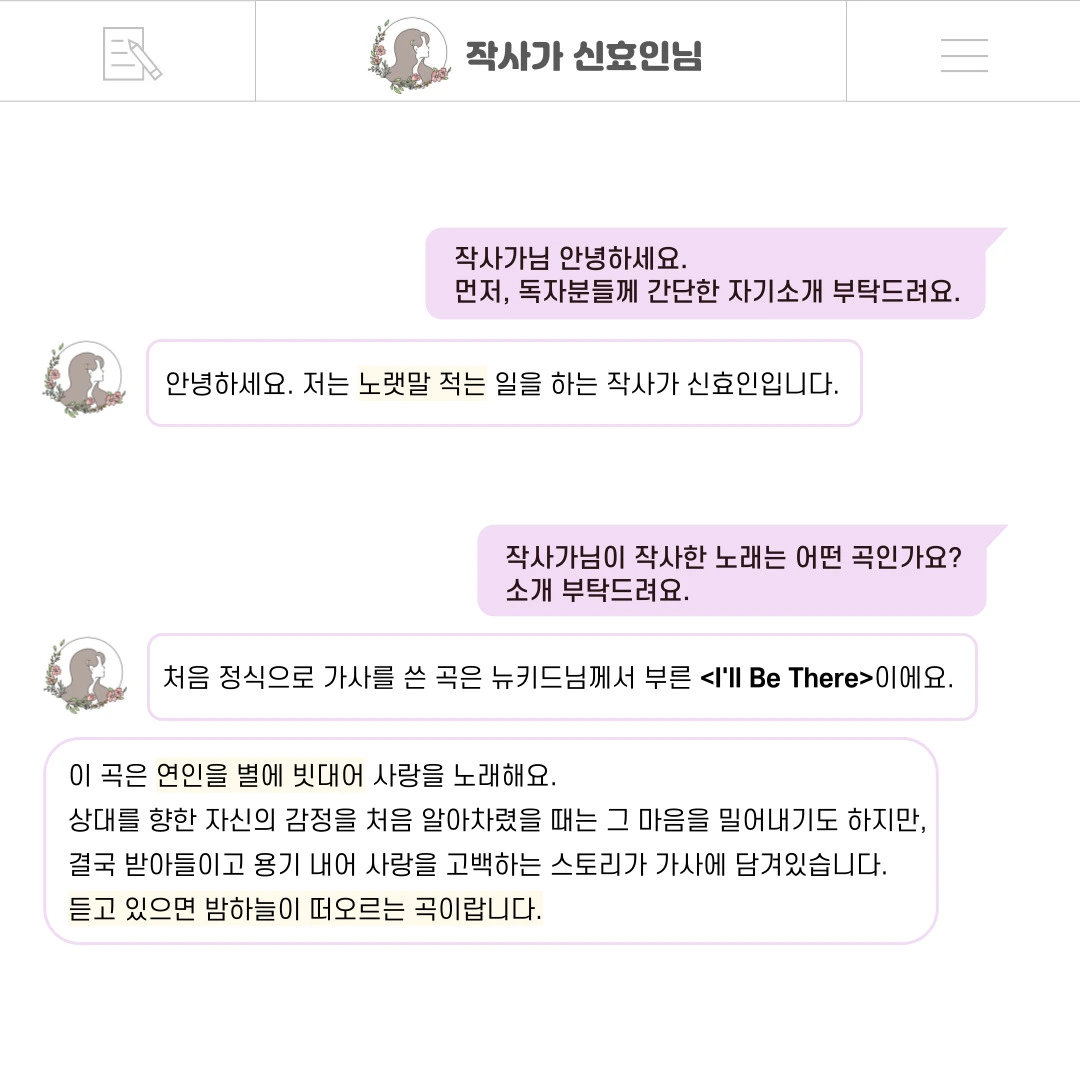 인터뷰 덕분에 올해가 다 가기 전에 작사가 신효인으로서 한 발자국을 또 남길 수 있어서 감사하고 행복했어요. 저에게 너무나도 의미 있었던 그 인터뷰를 저의 브런치 생일을 맞아, 독자님들께도 나누고 싶어요. 인터뷰 내용을 통해 독자님들과 한층 가까워질 수 있다면 더할 나위 없을 거예요ㅎㅎ