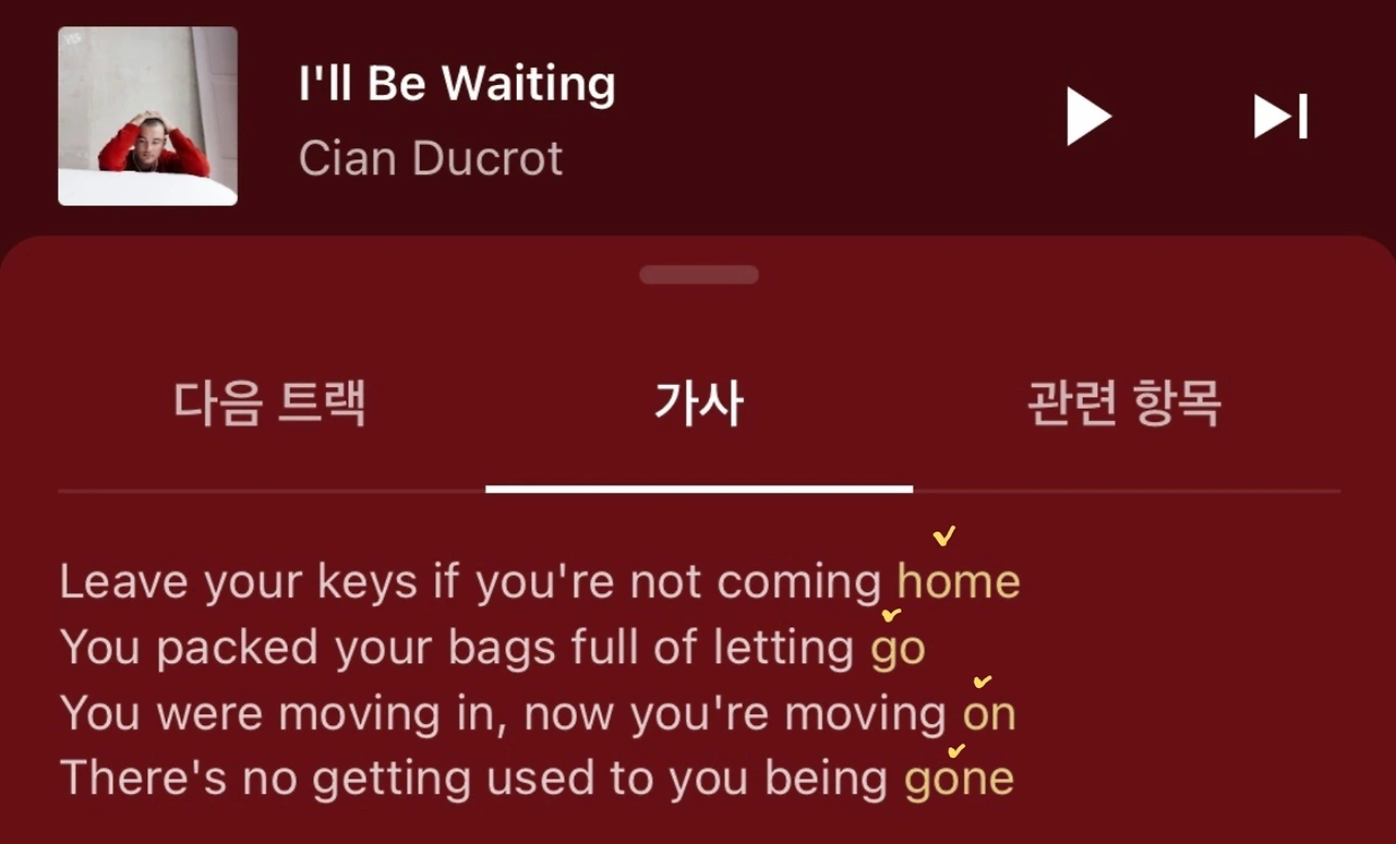 저는 따놓은 빈칸에, 라임을 지켜야 하는 곳을 표시해둬요. 팝송으로 예를 들어 보면, Cian Ducrot의 <I'll Be Waiting>이라는 곡에서 Verse 1의 끝 라임만 봐볼게요. '오' 라임이죠.