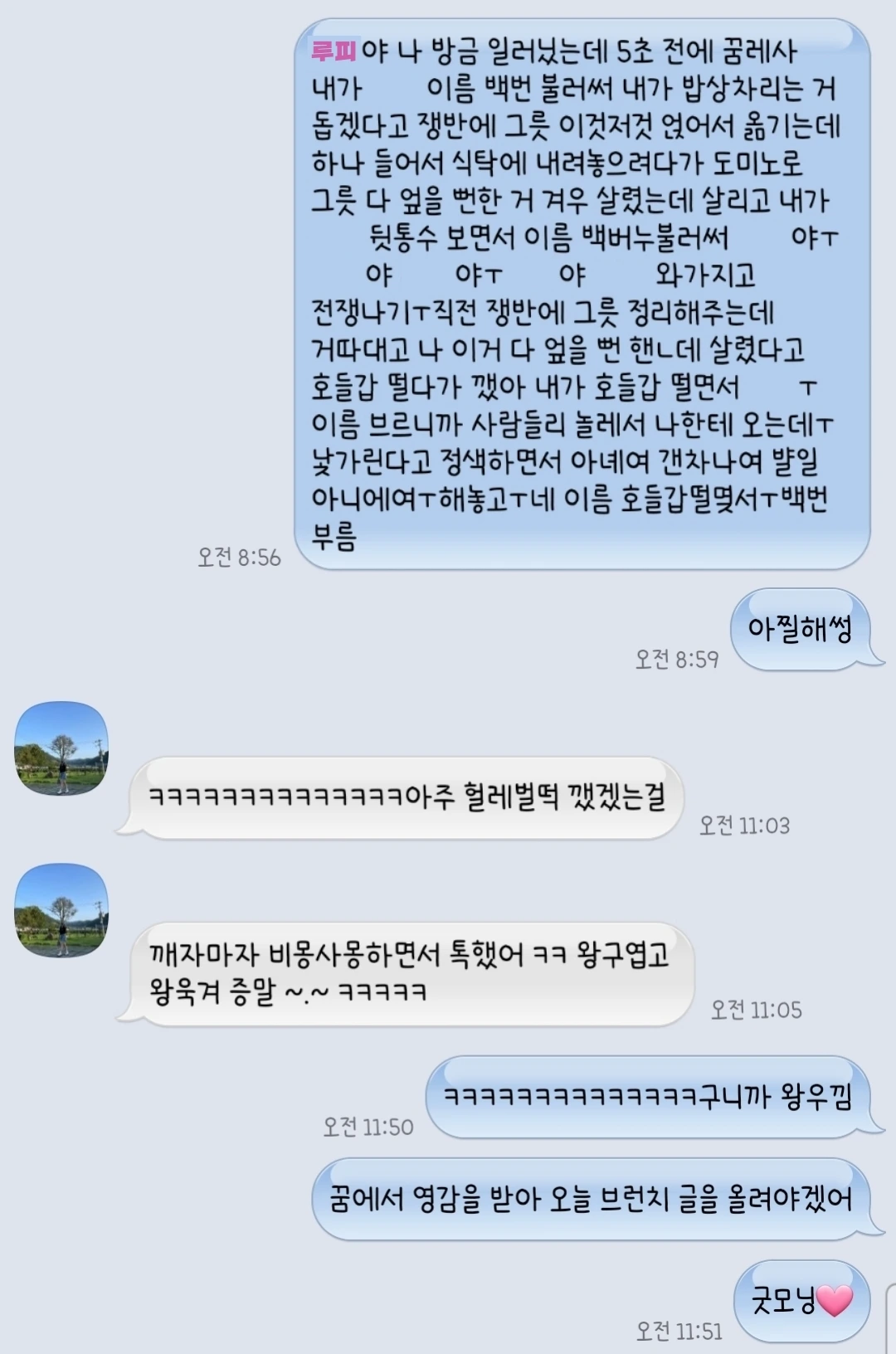 꿈이었지만, 난처한 상황에 내가 의지하고 사랑하는 사람이 있는 건 내게 감동 그 자체였다. (MBTI: 파워 I&파워 F) 그 감동의 여운으로 조잘조잘 시작되는 오늘의 수다 스타뜨으-