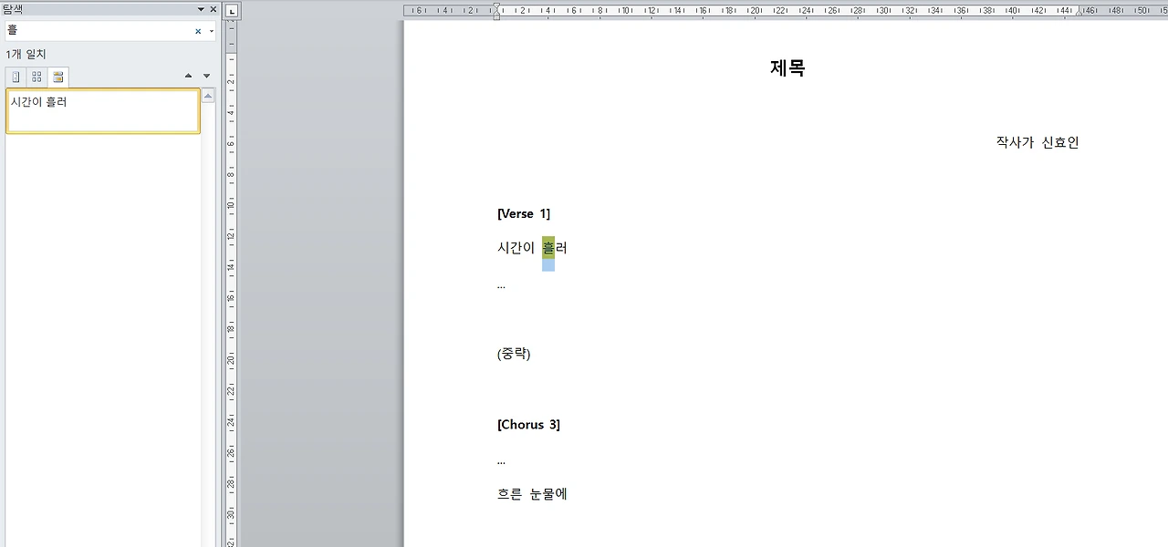 그러면 맨 마지막 줄의 [흐른]이 검색으로 걸러질 거고, [흘러]와 [흐른]의 의미/쓰임을 검토하면서 둘 다 둬도 되는지 또는 하나를 수정해야 할지, 뭘로 수정할지 고민해 보는 거죠. 판단에 따라 수정 없이 갈 수도 있고, 수정이 될 수도 있구요. 이 예시 같은 경우에는.. 저는 그냥 뒀을 것 같아요.