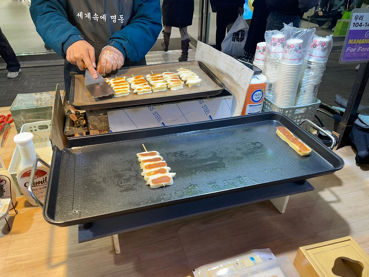 그리고 명동에는 야시장이 많이 즐비해있는데 한국인들은 안 사 먹는 것들을 외국인들이 사서 먹고 있었다. 한국인들이 안 사는 이유는 애초에 여기 올 일도 많이 없지만 무엇보다 너무 비싸다. 외국인 친구들한테 여기가 너무 비싸다고 얘기했지만 명동 치즈구이를 보고 동생이 너무 먹고 싶다고 하여 하나 샀다. 하나에 무려 5000원이나 했지만 그래도 먹고 나서 맛있다고 좋아했다.