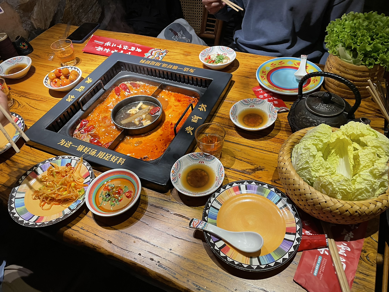 훠궈탕은 나는 처음에는 맑은 국물을 원했는데 그게 결국 여기서는 토마토와 다른 야채가 들어가는 빨간색국물이 여기 식당에서는 안 매운 훠궈탕이었고 그리고 하나는 매운 마라맛의 훠궈탕, 그리고 중간에는 버섯 같은 게 들어간 훠궈탕 이렇게 세 가지 종류의 탕으로 맛을 볼 수 있었다. 마라맛이 맵고 중독성이 있었지만 우리는 끝내 너무 매워서 안매운탕에다가 고기와 야채를 넣었다.