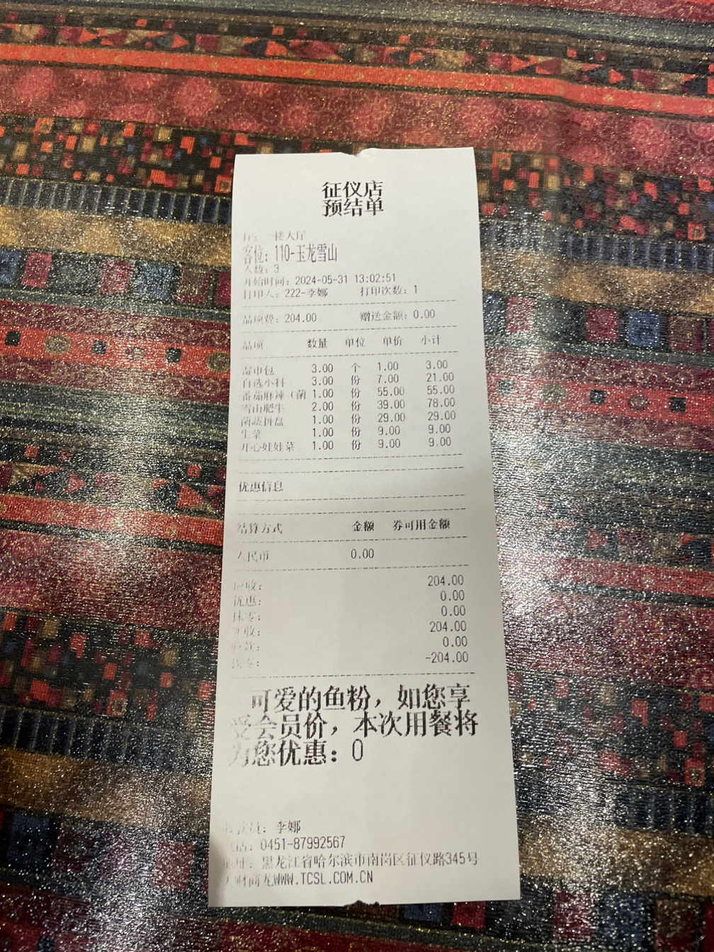 이렇게 배부르게 먹었는데 204위안이 나왔다. 알리페이로 200위안 이상 계산을 하게 된다면 수수료가 나가게 되는데 이때 6위안 정도 추가되어서 총 210위안으로 계산이 되어서 나가졌다.