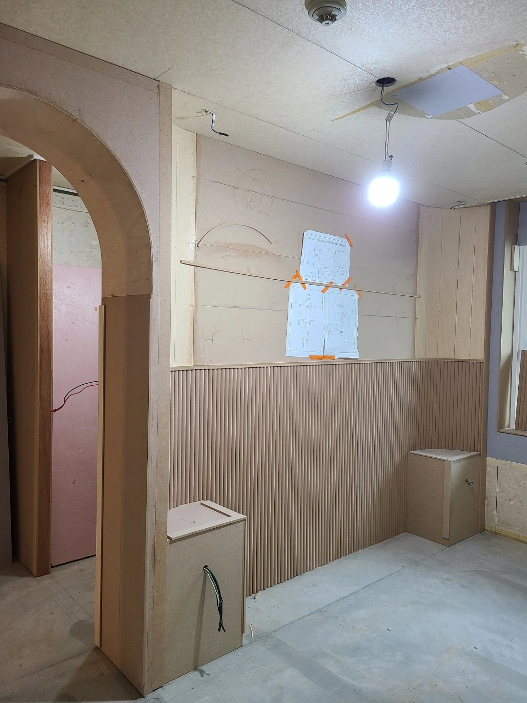 큰 구조는 철거 전에 확정되어야 하지만, 세부적인 가구나 가전 위치와 크기 등은 목공 전에 확정되어야 한다. 안방을 침실과 드레스룸으로 나눠주는 가벽이나 주방 냉장고 옆 가벽 등 공간을 나누어주는 가벽이 목공 공정 때 만들어지기 때문이다. 벽걸이 TV 설치를 위하여 거실 벽면에 나무를 덧대어 음각을 만들기도 하였다.